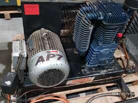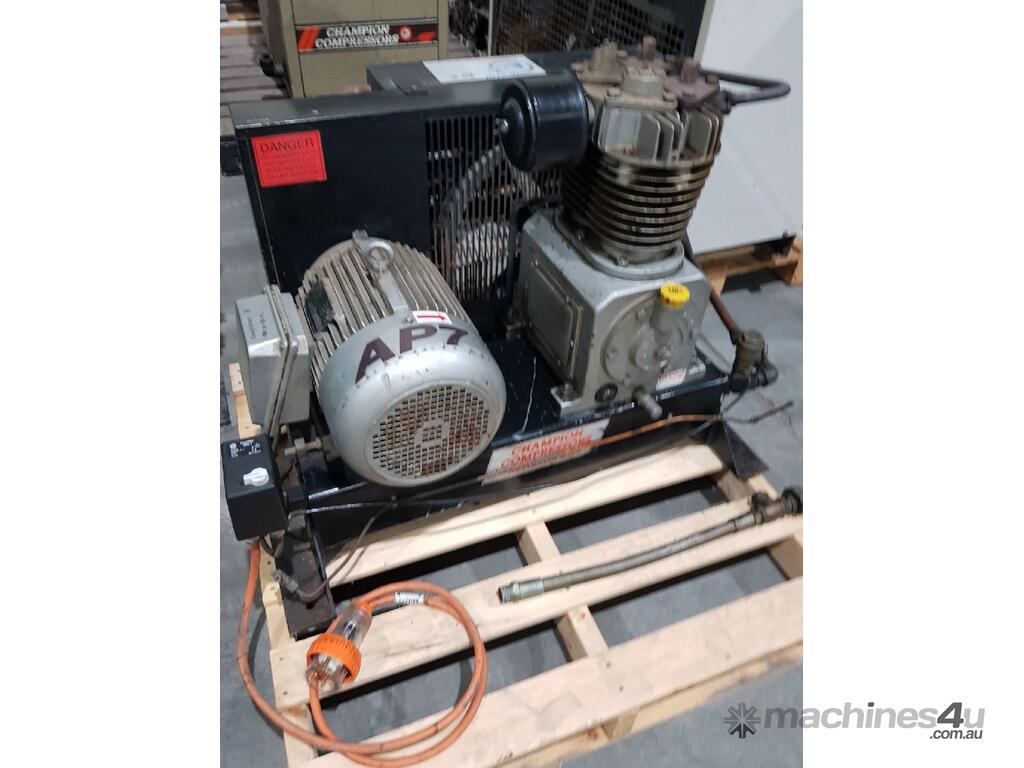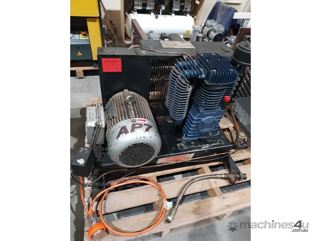 3). CHAMPION AP7 5.5kw 7.5hp 415v INDUSTRIAL RECIPROCATING AIR COMPRESSOR BASE MOUNT INCLUDING AFTERCOOLER FAN UNIT, HEAVY DUTY CAST IRON PUMP MADE IN ITALY, VERY GOOD ORIGINAL CONDITION