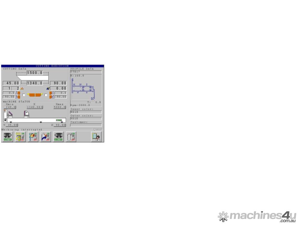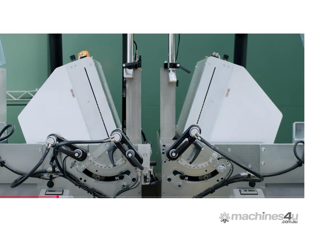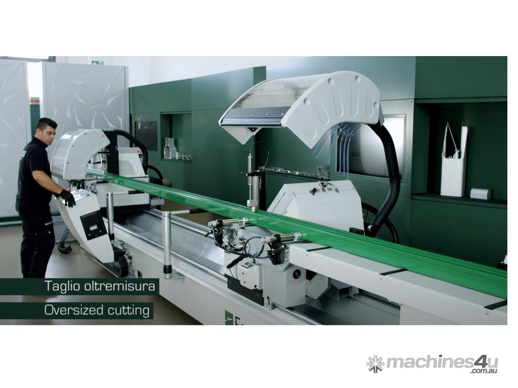 A double head sawing machine with controlled movement of the mobile head. The centralised, and movable, control panel allows the operator to efficiently load extrusions - while protected by the auto guard system and two stage clamps