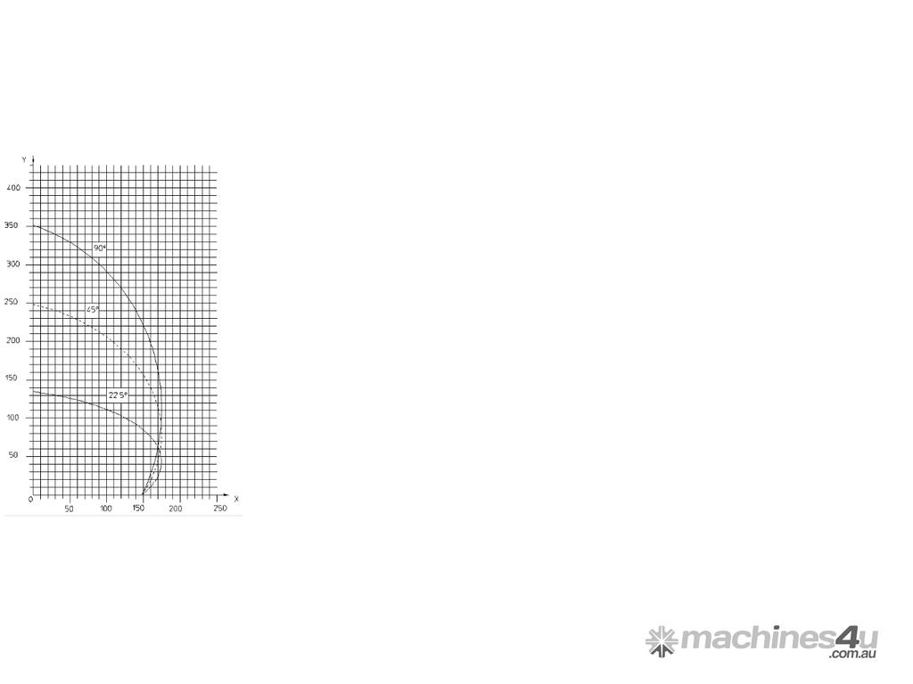 Head tilting from 22.5° outwards to 90° by pneumatic cylinders, with mechanical stops for intermediate angles