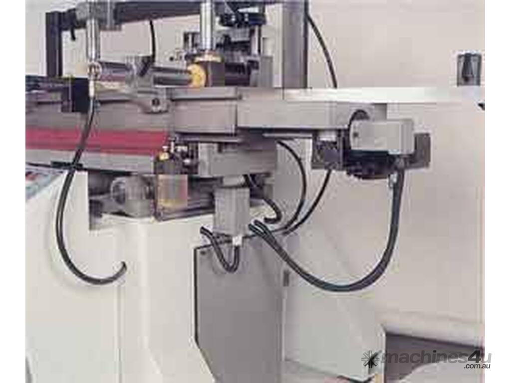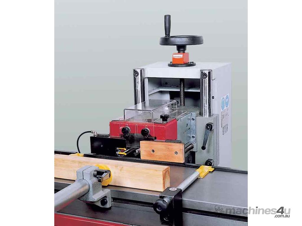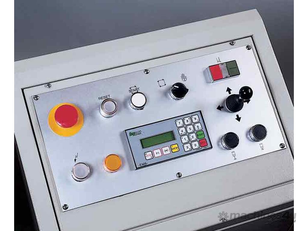 With the chisel mortising machine mod. MBO-T9 we have made a hihgly reliable electronic machine at a limited cost. The machine can make mortises of various lenghts and depths on windows, balconies and doors. It is equipped with a programmer with a backlit LC-display allowing immediate reading of entered data. Said programmer allows also to store the various programmes entered which makes the machine operation even quyicker. X-axis (longitudinal) transmission is made by trapezoidal screw driven by a speed variator plus a selfbreaking motor. The positioning is controlled by a revolving transducer (encoder ). The transversal movement is controlled by an airdraulic cylinder with adjustable speed and slides on round ground guides protected by scrapers. Lubrication by and pump, centralized. 3 pcs hydraulic pressor for clamping the pieces. Automatic table lock during operation. Chips exhaus fitting. Normalized electricals. All machine controls cannot be activated if the workpiece is not clamped. The machine is equipped with extra guides in aluminium fitted with compensating stops.
