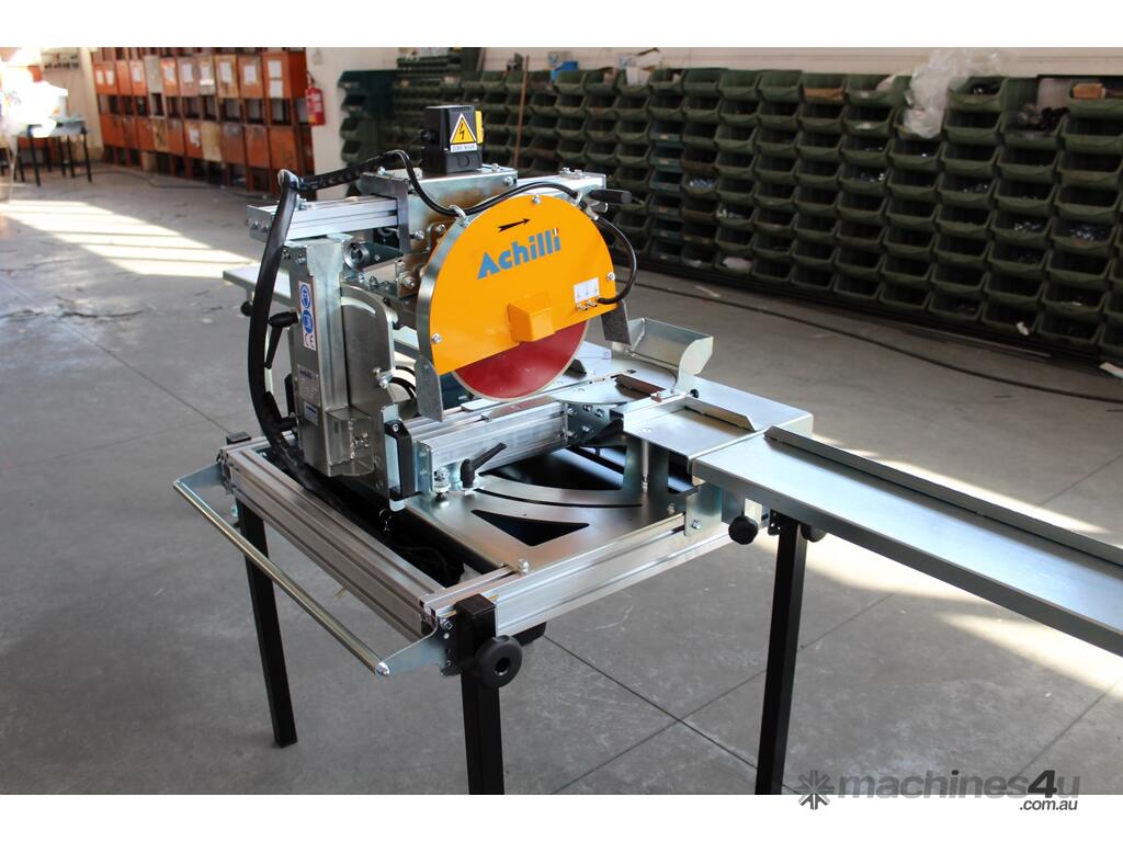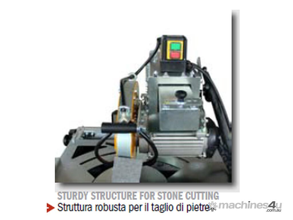 Wet cut sliding compound mitre saw for straight, bevel, plunge and mitre cuts in all directions. Study structure made of galvanized steel to cut all types of stone. Made in Italy.