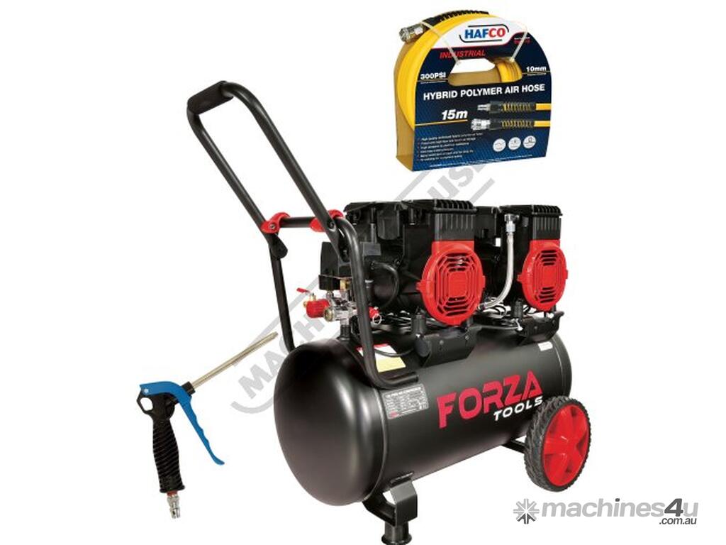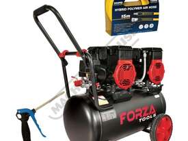 FORZA TOOLS FT2296050 OIL-LESS AIR COMPRESSOR BUNDLE 50L Tank / Twin 2 Hp motors BONUS HOSE REEL AND AIR GUN