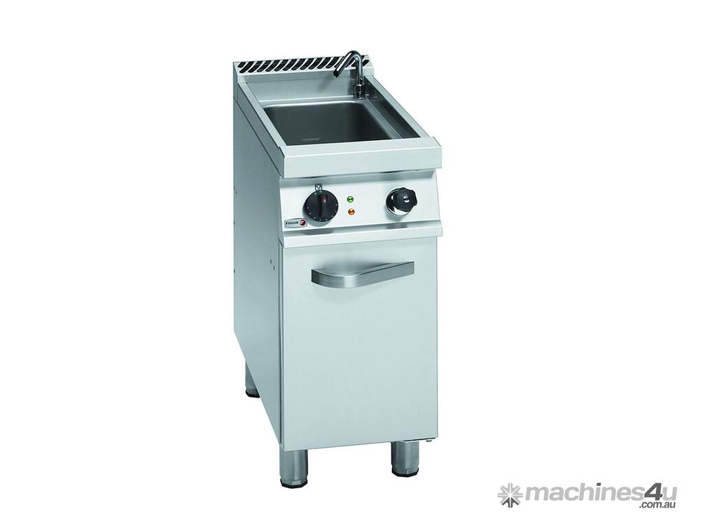 Fagor 700 series natural gas pasta cooker with cast iron burners CPG7-05 The 700 Series pasta cookers consist of an AISI-316 stainless steel vat. Available with tubular burner, the cookers have a pilot light ignition system and a safety thermocouple, thermostatic temperature control and a tap for filling the vat. Made of stainless steel. Cast iron burners. Thermostat temperature control. Water filling tap. Drainage valve. Capacity: 20 liters. Power: 14 kW or 50 mj./h 2 1/2 Size Baskets included Dimensions: 350 x 775 x 850mm. *Supplied on height adjustable legs; total height adjusts from 850mm to 900mm * Unit is not supplied with power cord and plug. These must be installed by a qualified electrician. 2 Years Parts and Labour + 2 Years Parts only Warranty with Product Registration Depth: 780 mm | Width: 350 mm | Height: 850 mm | Power: 14 kW or 50 mj/h | Net Weight: 60 | Price: $4680 | Manufacturer: Fagor
