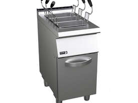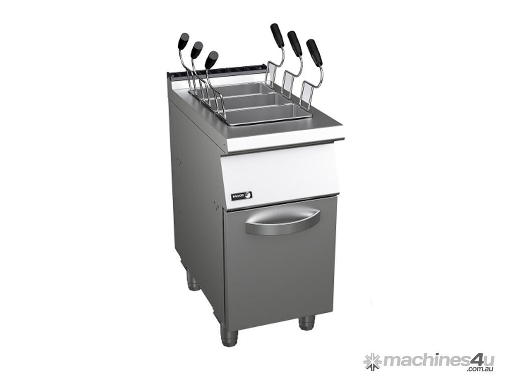 Fagor Kore 700 Series Gas Pasta Cooker with 3 Baskets - CP-G7140 Key Features Surface tops manufactured in 1.5 mm thick AISI-304 stainless steel. Laser-cut joints, automatic welding, and polishing. Hidden screws. 1.5 mm thick AISI-316L stainless steel wells built into the surface top. The well is filled through the inlet solenoid valve with a two-position switch: average and high-speed filling. Well drainage through a mechanical ball valve which is resistant to high temperatures and has a safety overflow. Automatic safety system to stop the current if the water runs out. Controls with a protective support base and system to prevent water infiltration. Machines with IPX5 grade water protection. GN-1/1 wells, with 40-litre capacity (they can be used with different positions of baskets of different sizes). High-performance stainless-steel burner located outside of the well with a combustion chamber that enables heating of the base and sides of the well (up to the minimum filling level). Burner ignition through electronic spark igniter. With an access tube for manual ignition. Heating controlled through a safety valve." 2 Years Parts and Labour + 2 Years Parts only Warranty with Product Registration Depth: 730 mm | Width: 400 mm | Height: 850 mm | Power: 230V - 1N; 2A; 0.1kW | Net Weight: 55 | Price: $8499 | Manufacturer: Fagor | Warranty: 2 Years Parts and Labour + 2 Years Parts Only for Products Registered within 14 Days of Invoice