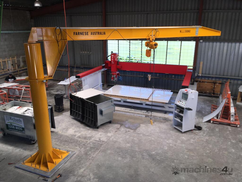 Farnese Jibcrane 360 degrees 500kg is Perfect for Stone Benchtop manufactures to load their machines with ease. Move stone slabs around the factory, safely and easily. Cut down on the required man power buy using a Farnese Jibcrane