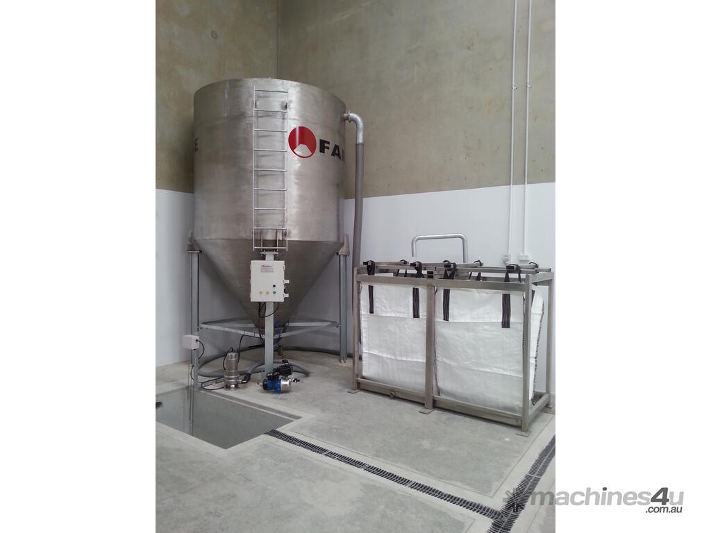 The system consists of a 7500 litres stainless steel silo, sludge collection bags and stand, pit pump and a delivery pump back to your factory. The Silo also includes a flocculant system which adds a mixing technique that promotes sludge to flow through your system without it forming a cake and clogging the filtration system.