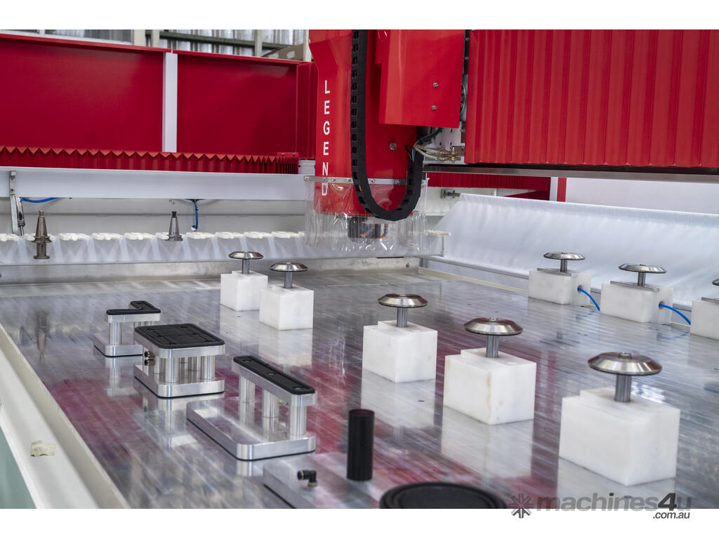 A full table, 3 Axis CNC work centre, to value add all your benchtop works. The LEGEND is a simple cost efficient machine that can take a full slab and can do your undermount cutouts, drill holes, drain grooves, flat drain board recess, outside edge profile work, shaping and polishing using the appropriate tooling, engraving and all other functions that might be relevant to today's benchtop manufacturing.