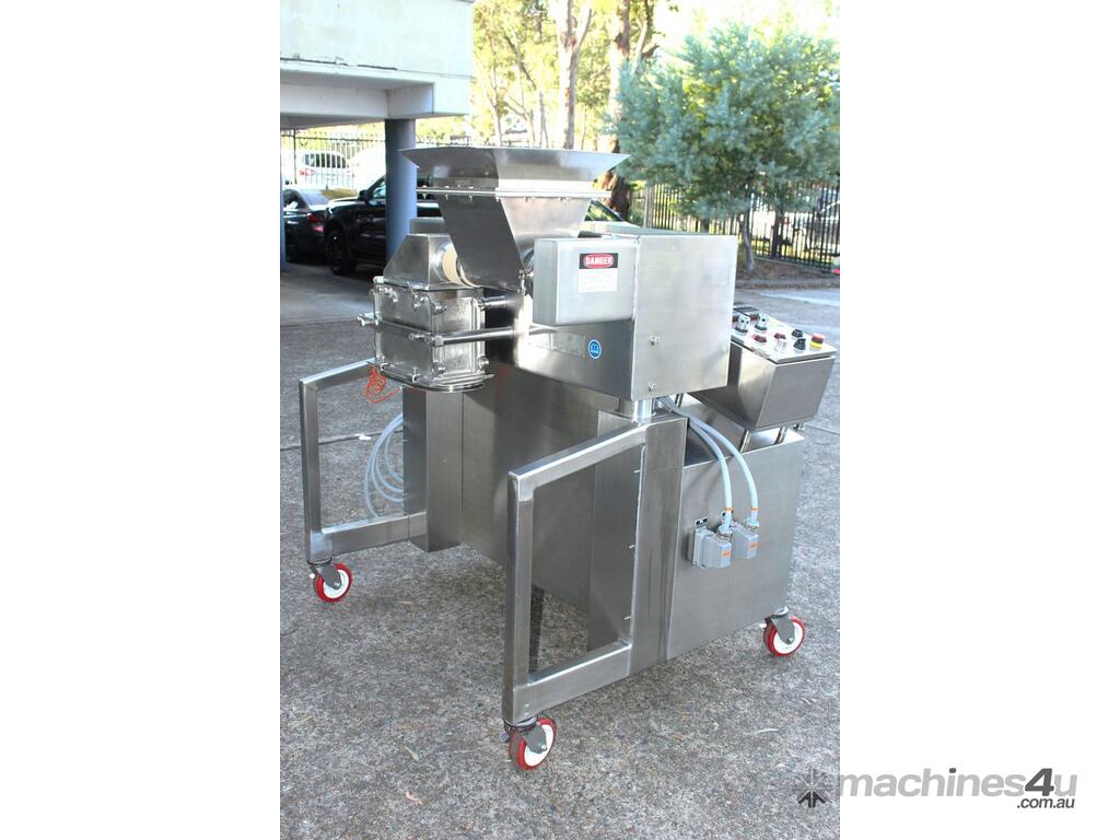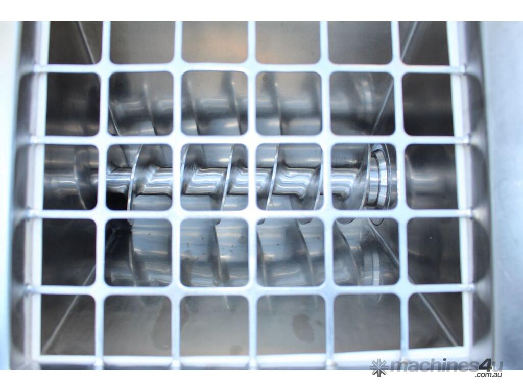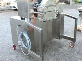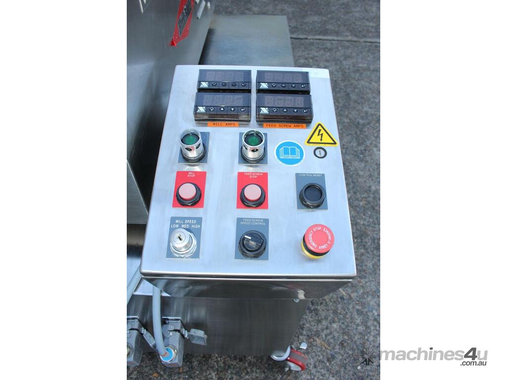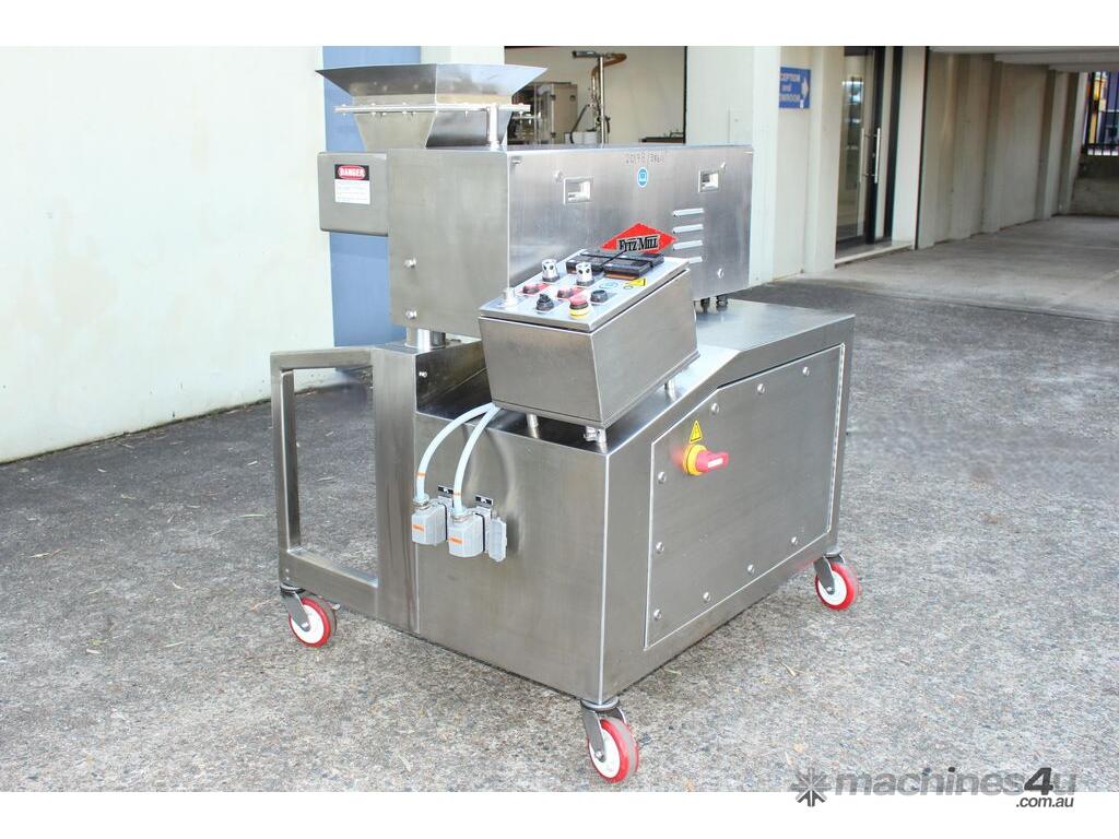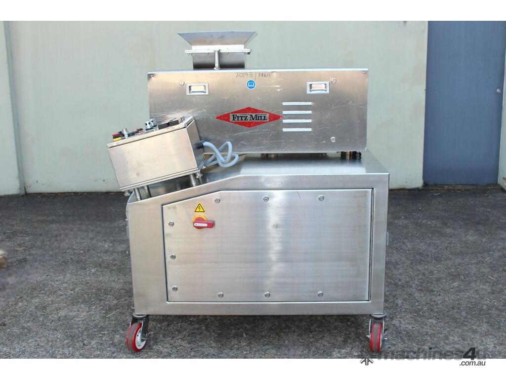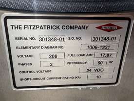 Fitzmill Hammermill with Auger Feeder, "Fitzpatrick" model D6A, high throughput rates of 200-1,000 kg/hr, auger screw feed system with hopper, 208V three phase, 18A full load Amp, 60Hz, complete with one interchangeable screen, mobile stainless steel construction
