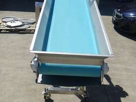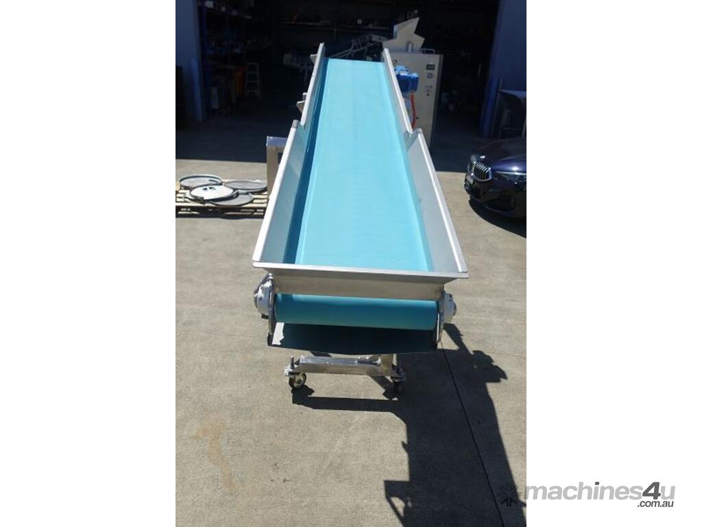 Conveyor has quick release belt and has hinged sides 100mm high.