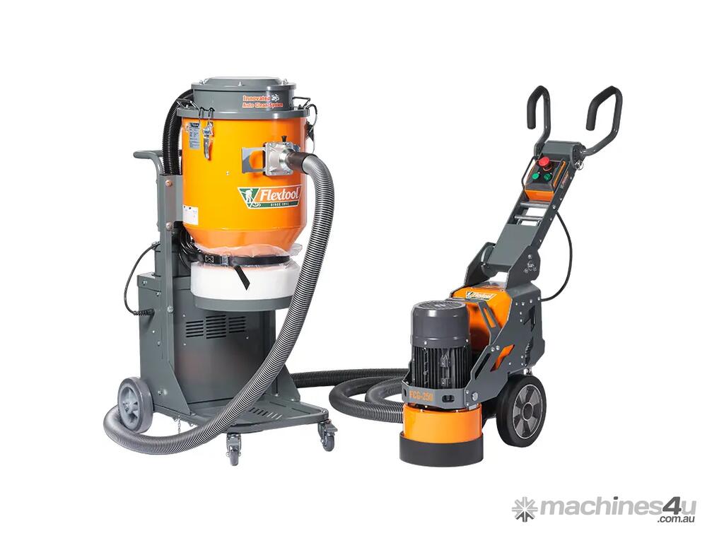 The Flextool Single Head Concrete Grinder FCG-250 should be used with a quality H-class dust collector, such as the Flextool Dust Collector FDC-1A or FDC-1M