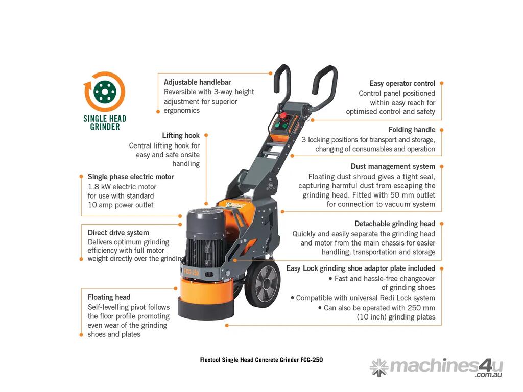 The Flextool Single Head Concrete Grinder FCG-250 is compact in design and delivers exceptional grinding capability. The combination of the direct drive system and the motor positioned over the grinding head, allow for efficient and aggressive grinding. Designed for professionals, the FCG-250 has a detachable grinding head for easier transportation, a folding handle with adjustable handlebar, easy access control panel and a central lifting hook.