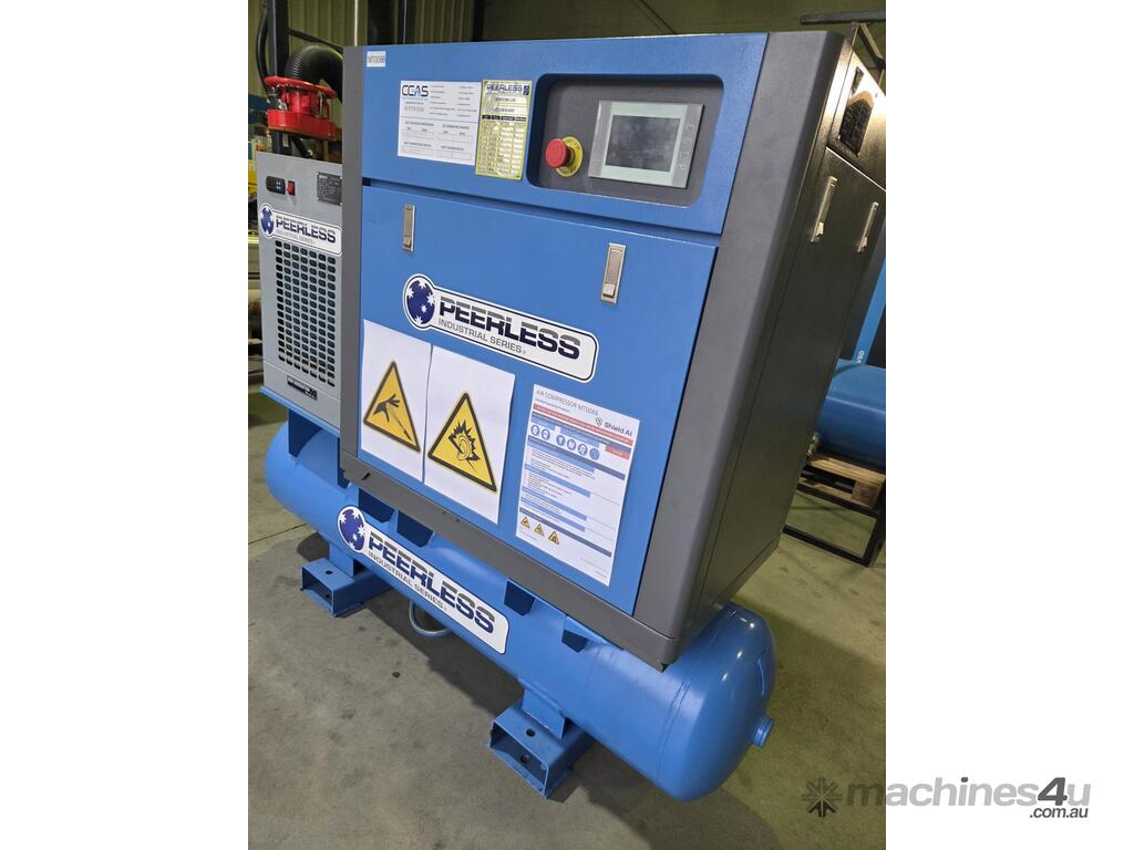 2). PEERLESS WBVZ 7.5kw 10hp 415v 10 BAR 35.4CFM VARIABLE SPEED 3-IN-1 FULLY FEATURED ROTARY SCREW COMPRESSOR Year 2022 INCLUDING BUILT-IN REFRIGERATED AIR DRYER/FILTERS MOUNTED ON 300 LITRE AIR RECEIVER TANK, GENUINE LOW 605 RUN HOURS/73 LOAD HOURS. ULTIMATE HEAVY DUTY TOP-SPEC MODEL. VIRTUALLY 'NEW'.