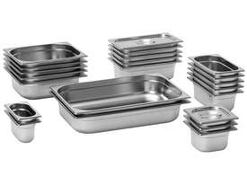 Food Tek 1/3 x 65 mm Gastronorm Pan AUSTRALIAN STYLE - 13065 Key Features HEAVY DUTY ALL STAINLESS STEEL 0.6 mm Patented stackable and nestable design Fine, smooth finish Double rim for strength & rigidity Depth: 176 mm | Width: 325 mm | Height: 65 mm | Price: $14 | Manufacturer: Food Tek