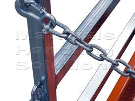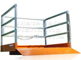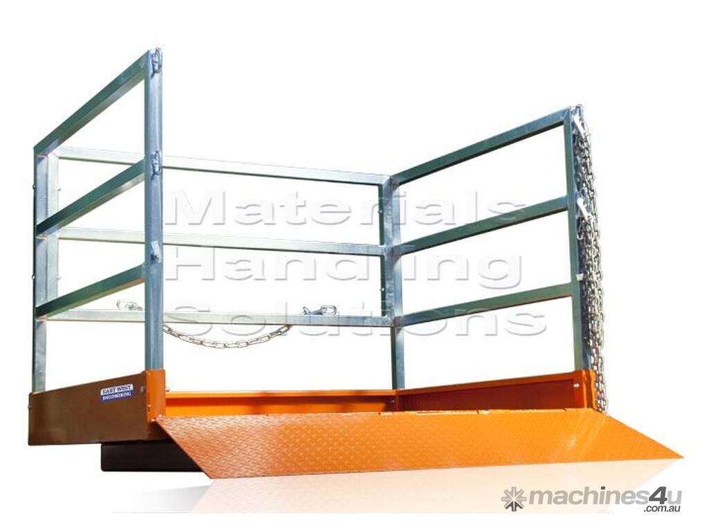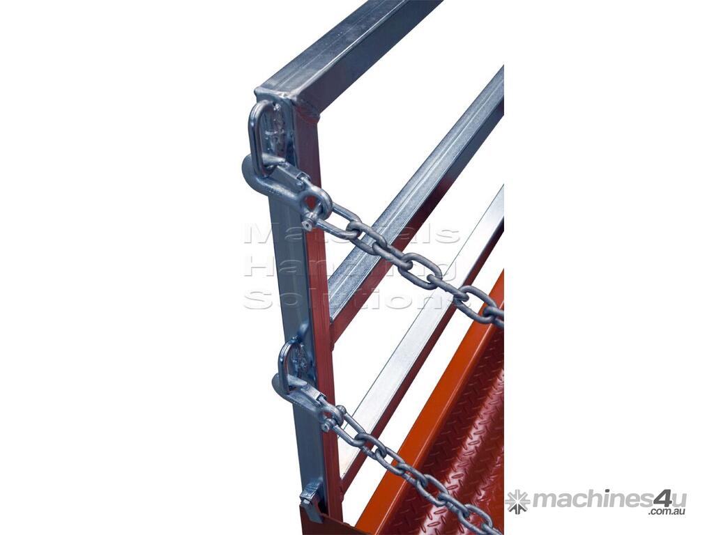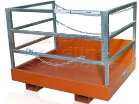 The hinged front ramp allows for trolley access Goods are secured by locking the ramp in a vertical position and attaching two safety chains Zinc sides with enamel paint finish on the base The forklift goods cage is supplied as a ‘flatpack’ for easy on-site assembly.