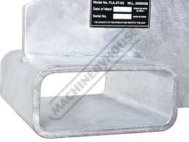 The FLA-2T-2G is rated at a Working Load Limit (WLL) of 2 tonne (2000 kg) when correctly positioned and secured on the forklift tines, with the load point located 600 mm from the forklift mast and the safety chain fully attached.