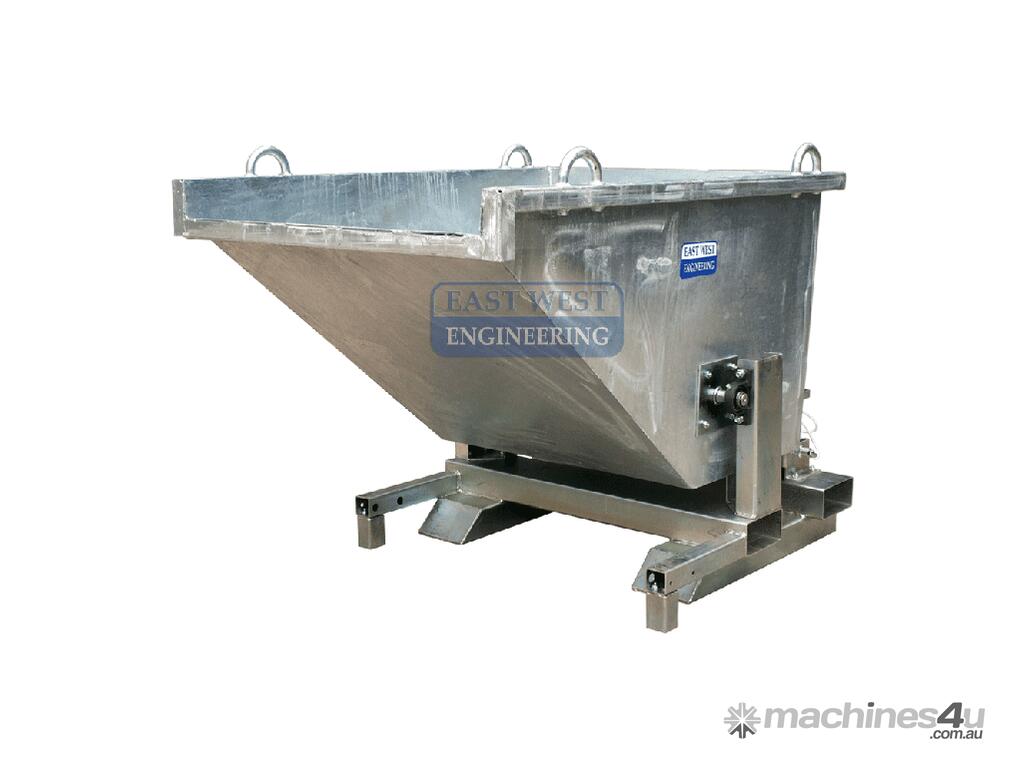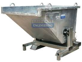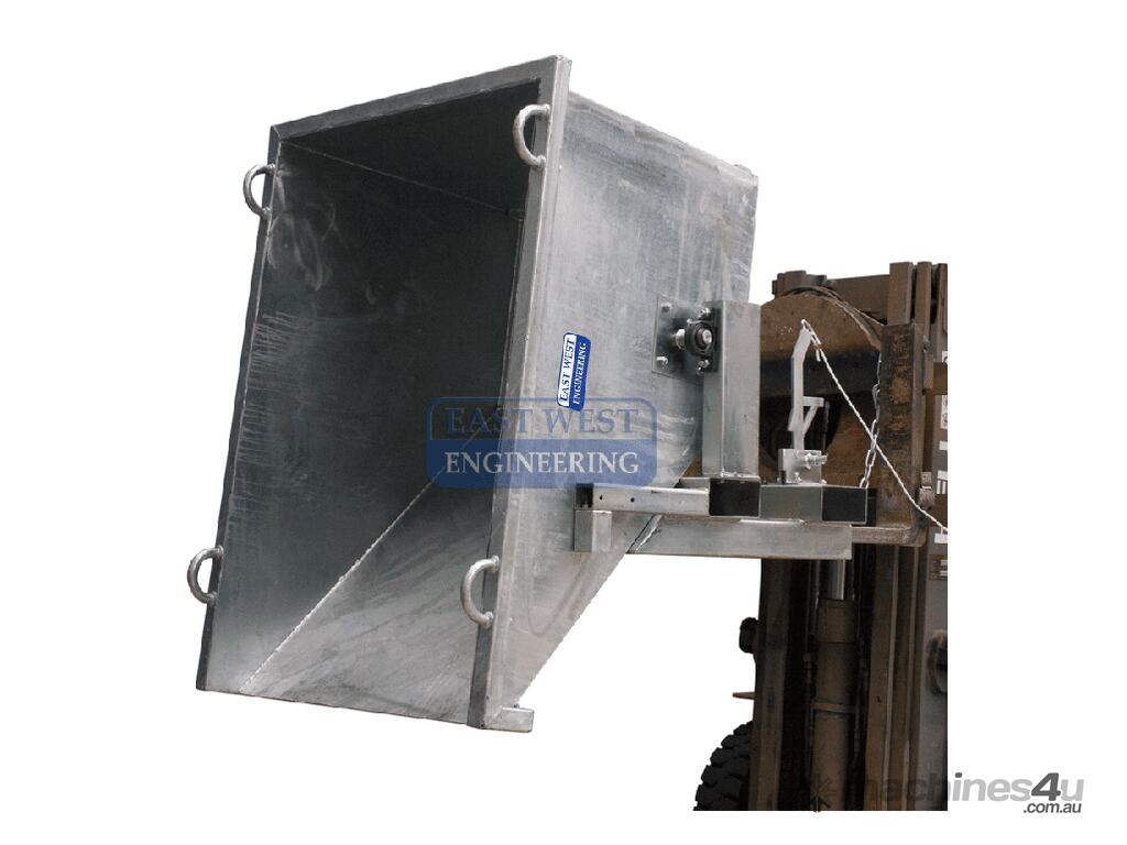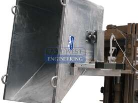 It features a safe lever release that can be operated from a forklift seat, with a capacity of 0.77 cubic metres and a weight limit of 1.5T.