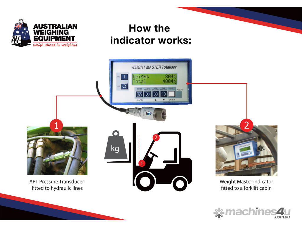 The ‘Weight Master’ instrument produces a weight reading via a pressure transducer that is fitted to the hydraulic lines of the fork truck. The pressure transducer has a sensing element which responds to force applied by the hydraulic fluid in the fork truck hydraulic lines when a load is lifted. The ‘Weight Master Totaliser’ instrument is mounted in the cabin where the