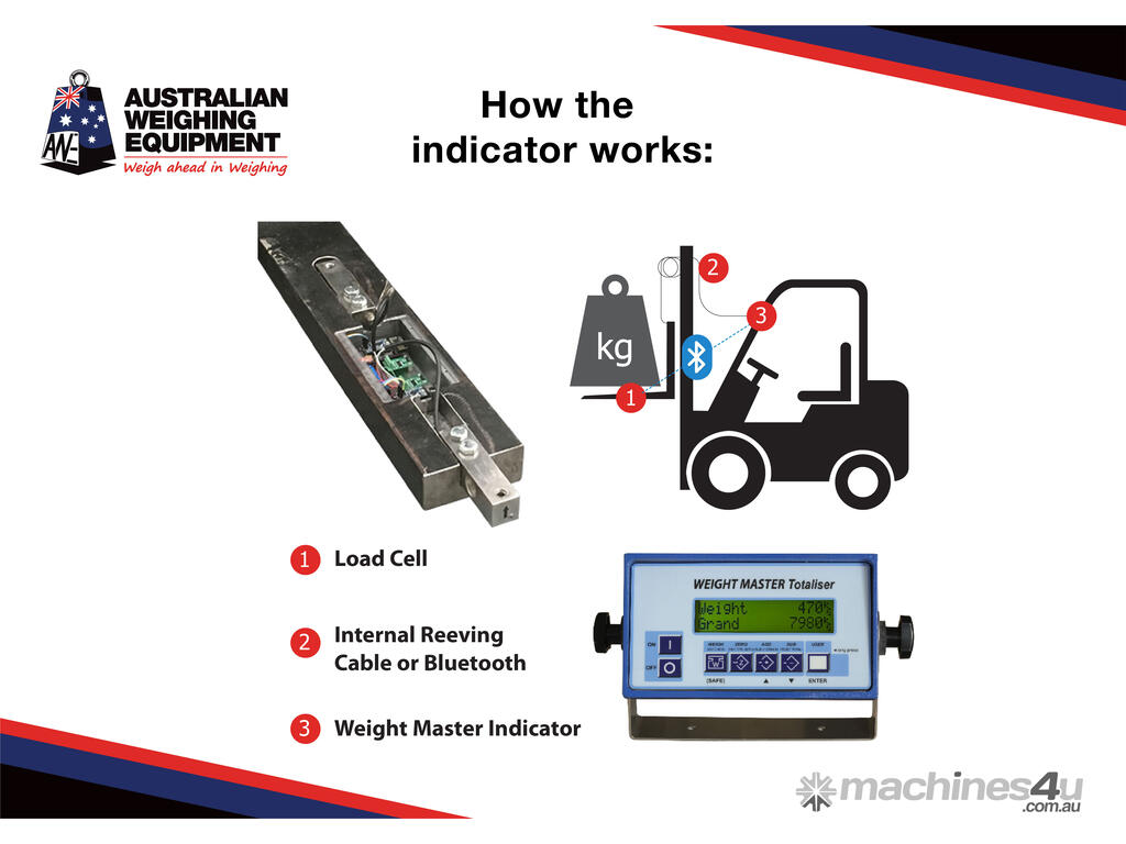 Installation is quick and easy - simply remove the existing tynes and fit the new fork tyne weigher to the fork carriage.A ‘Weightmaster Totaliser’ indicator is then mounted in the forklift cabin within easy reach and sight of the operator. Our solid state design is virtually maintenance-free with no moving parts or hydraulic devices to service.
