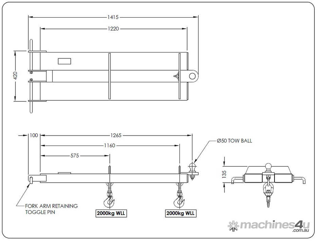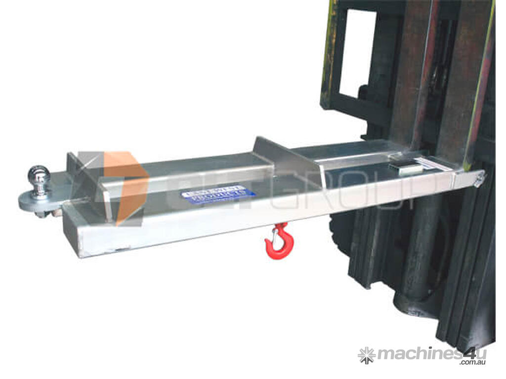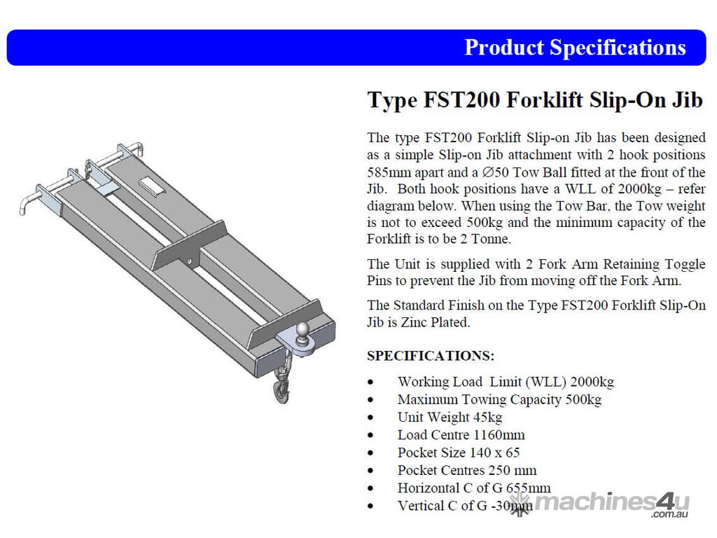 The FST200 SLIP ON 2000kg TOW JIB is a dual purpose, lightweight forklift attachment which allows towing with the attached 50mm towball, and doubles as a 2000kg WLL lifting jib.
