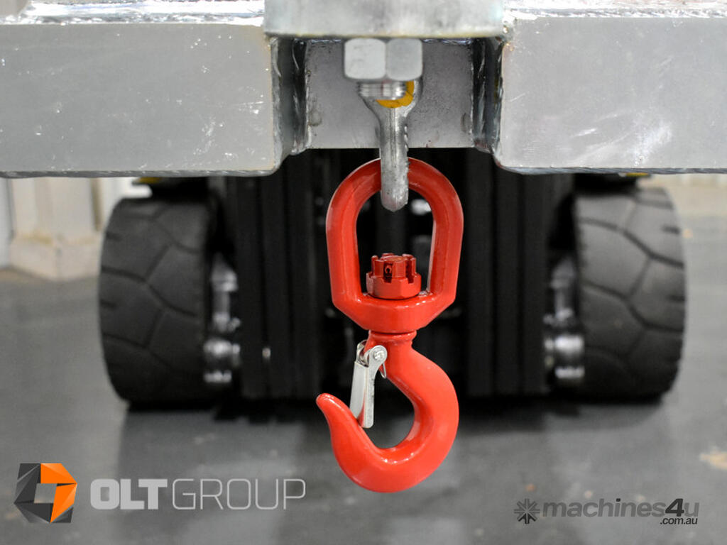 Our 2 tonne tow jib includes a 2 tonne safety swivel hook, with two lifting hook positions, utilising two fork locking pins to secure the jib to the forks during operation.