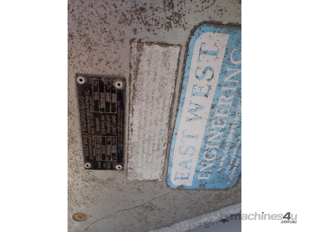 Forklift spear/prong attachment, Eastwest Engineering brand, 2020 build, 4000 KG rated, class 3 hook up, spear/prong 100mm diameter x 1400mm long overall 1200mm clear length, very solid unit, suit many uses, class 3 pick up 510mm between hooks (20 inches), in very good condition.