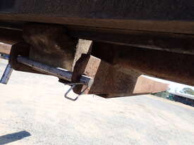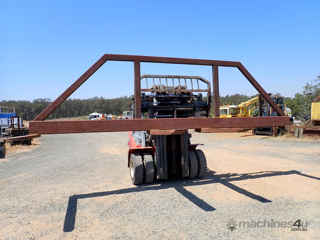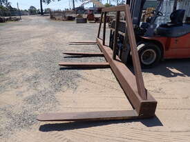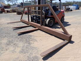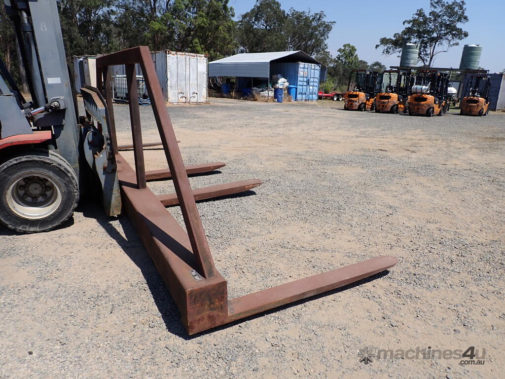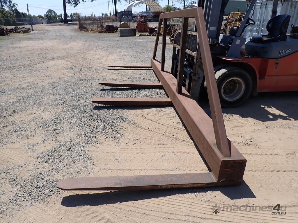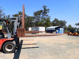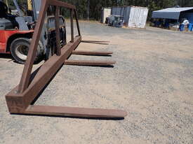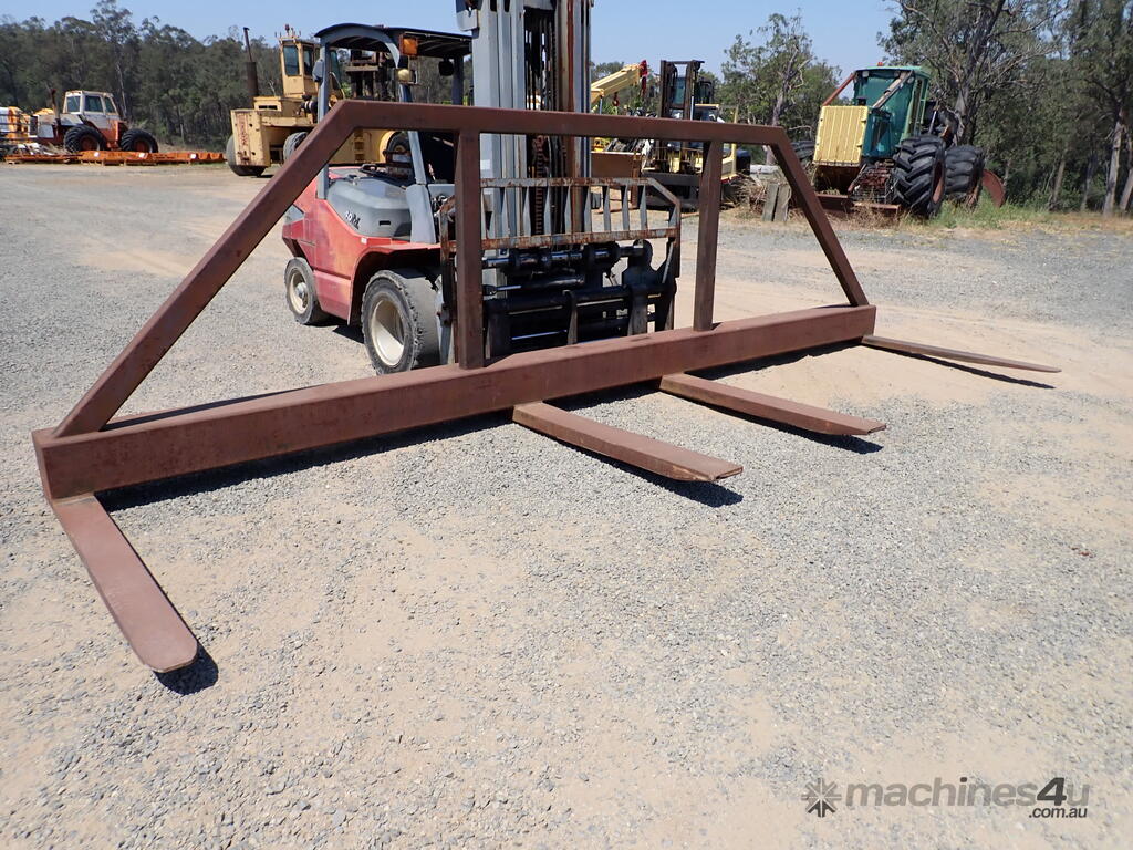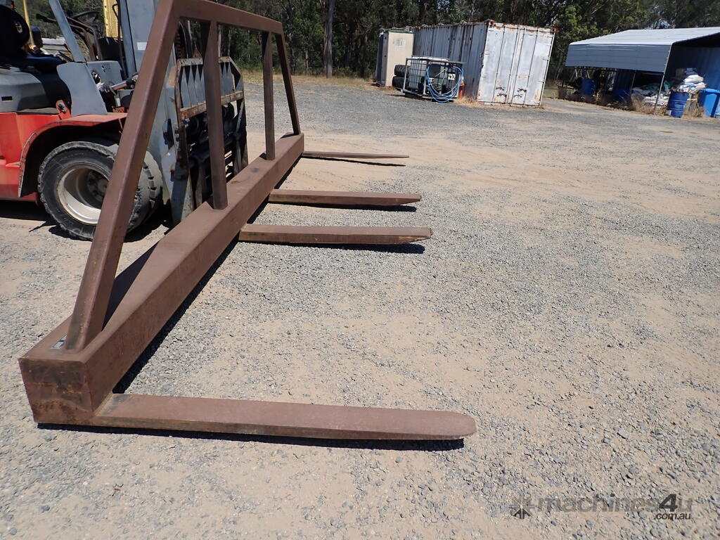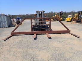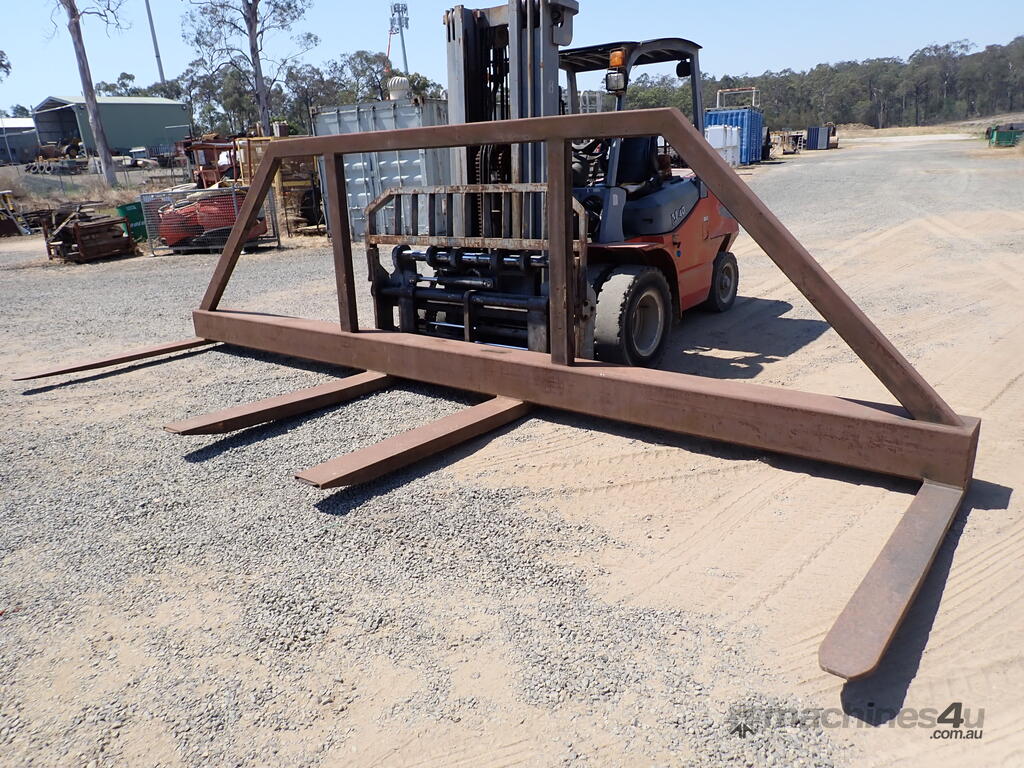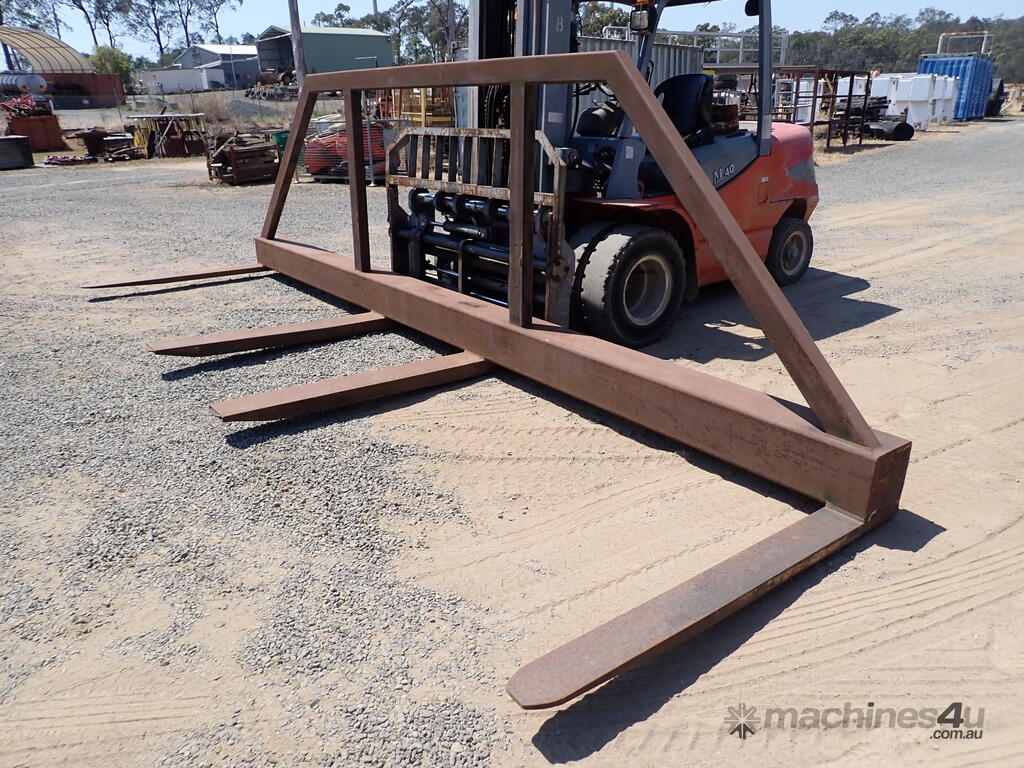 Forklift spreader bar attachment, Sattach brand, 2011 build, model FOLSAS050600, tare weight 850 kg, 6m wide, 1.5m long forks, 1.6m high load guard, 5 tonne rated at 750mm load center, good condition, suit handling long lengths or bundles or similar, fits onto forks up to 1800mm long, has lock pins.