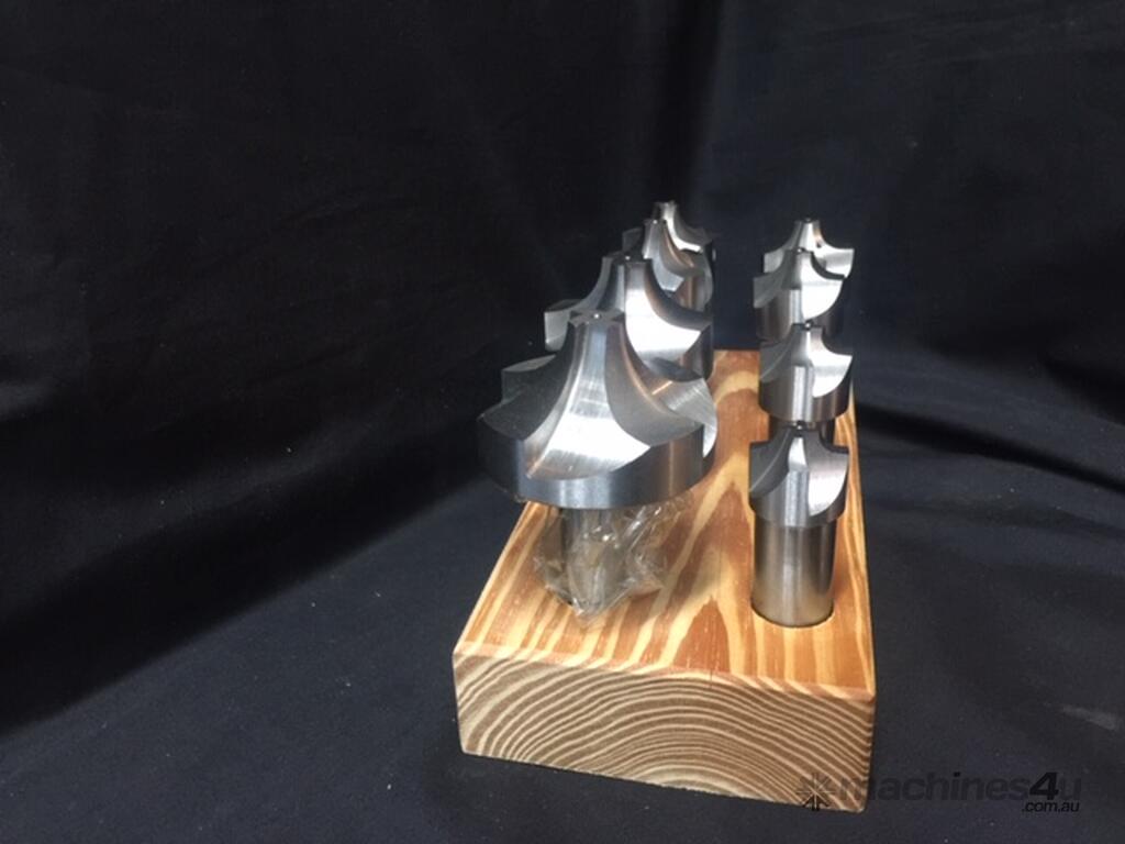 This M2 high speed steel Corner Rounding End Mill Set includes 4.8mm radius, 6.4mm radius, 8.0mm radius, 10.0mm radius, 11.2mm radius, 12.7mm radius, 16.0mm radius, 20.0mm radius,end mills. All cutters have 19.00mm shanks and sizes 4.0mm through 10.0mm have 12mm shanks. These end mills can be re-sharpened many times without changing the radii. Includes wooden stand.