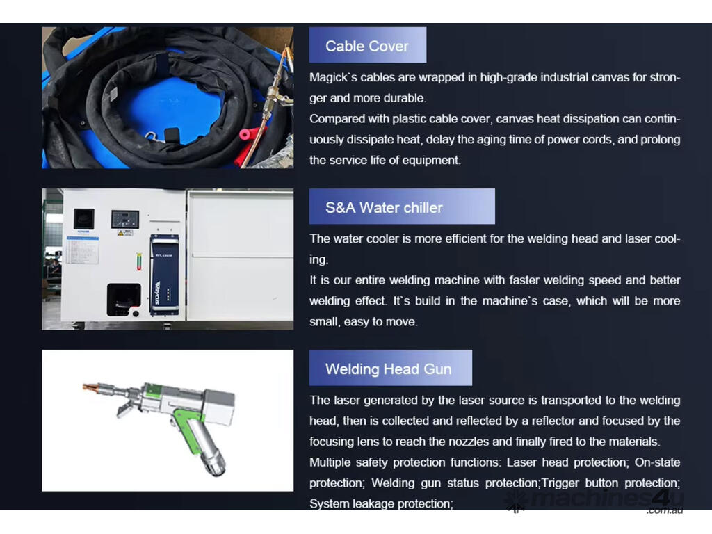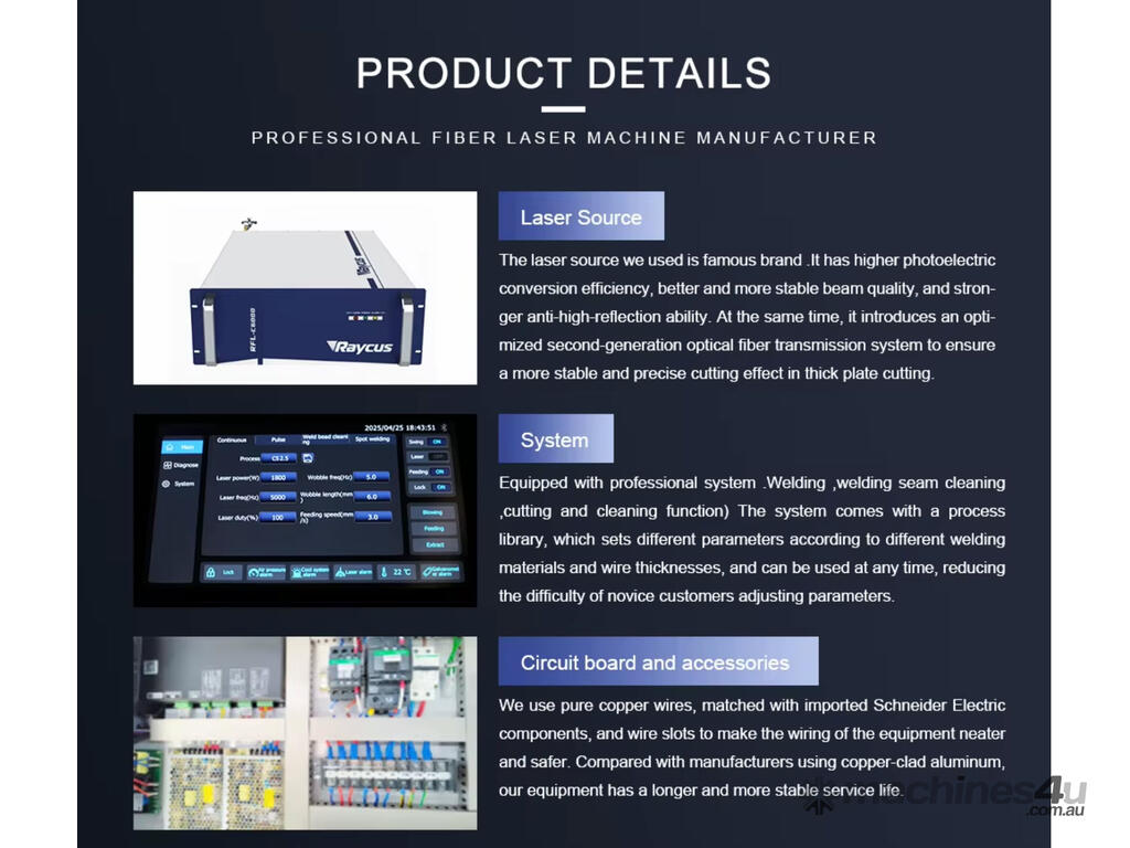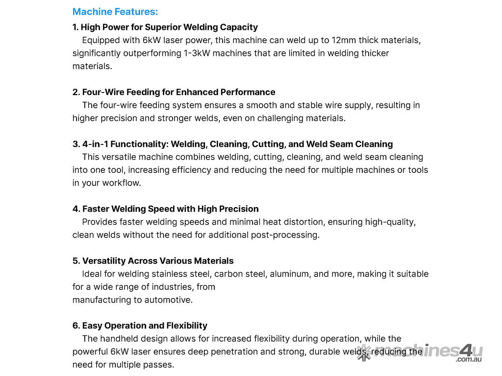 This 6kW handheld laser welding machine is designed for heavy-duty, high-precision welding. With its four-wire feeding technology, it allows for welding on materials up to 12mm thick, offering superior capabilities compared to most 1-3kW machines on the market.