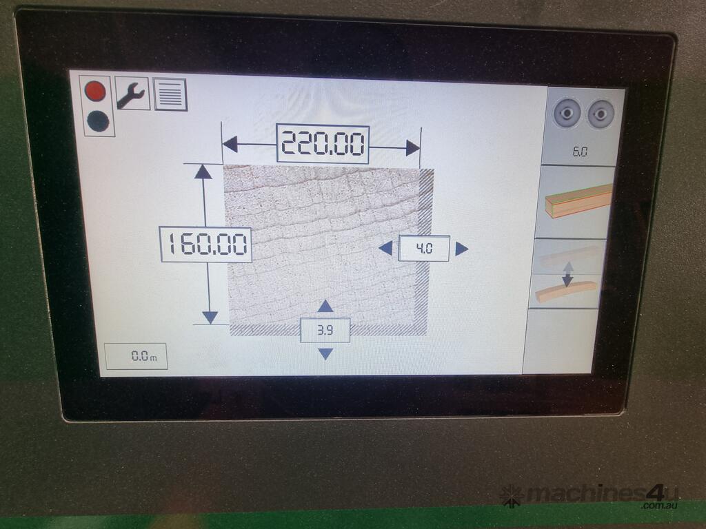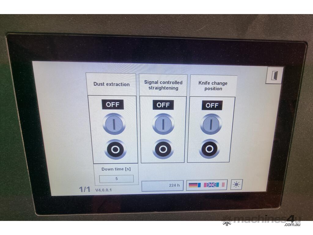 Operated from the single touchscreen. Just enter the dimensions required and the amount to be taken off the face side and edge and the machine will automatiy adjust. Laser line guides to show the amount being removed. Straightening function adjusts the in feed roller pressure. Knife change positions pre set into the machine to aid with cutter changes. All planer blades can be changed or rotated in minutes.