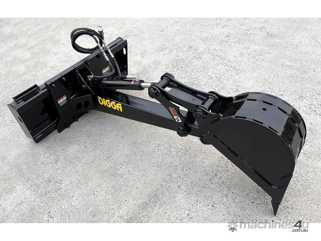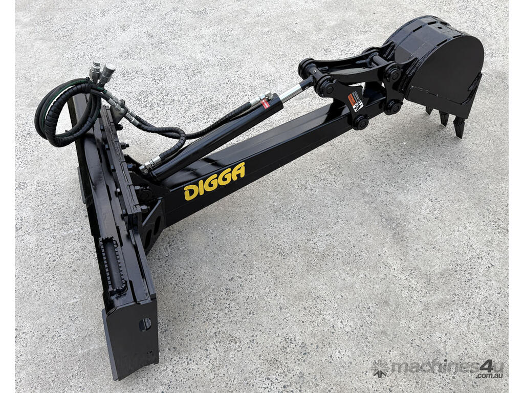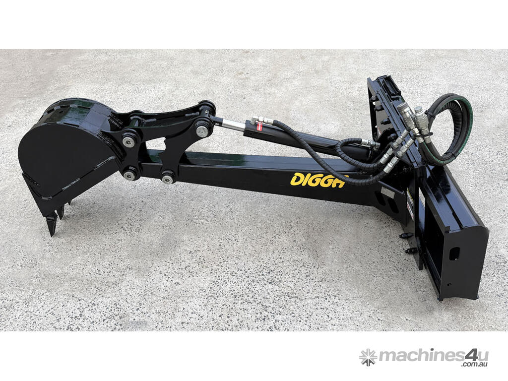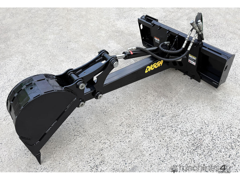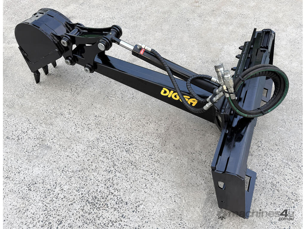 Digga front hoe for skid steers (skid hoe) – excellent condition (near new) – flat-face couplers – 300mm bucket – digs trenches up to 1.7m deep with a skid steer – often eliminates the need for other machines.