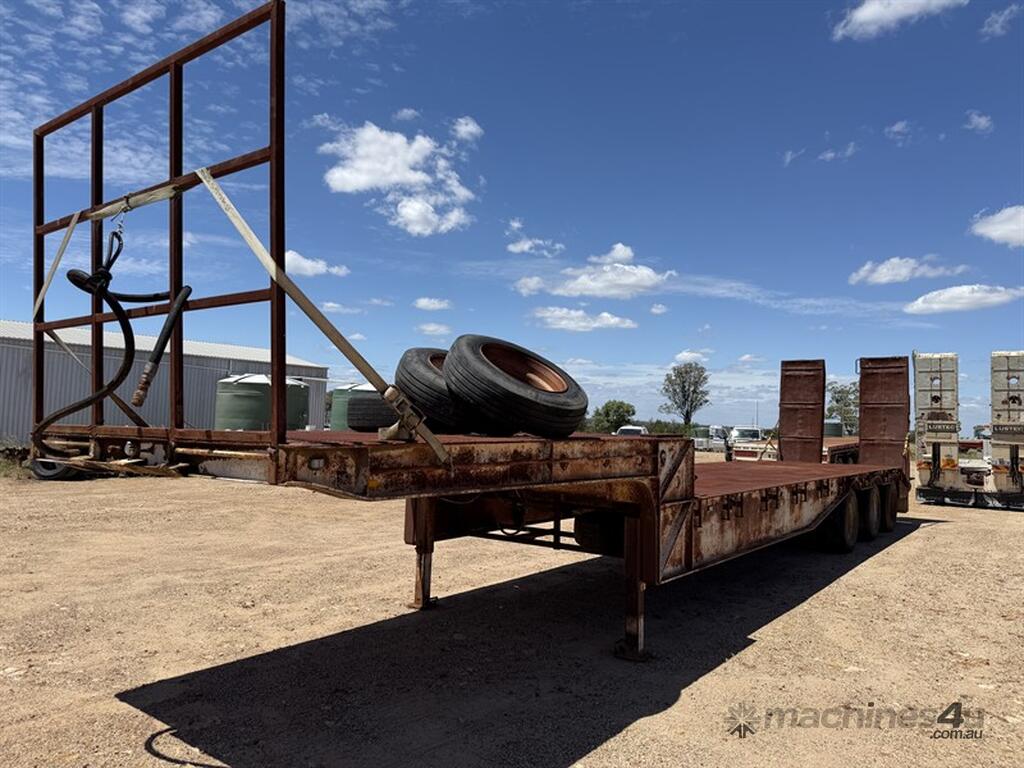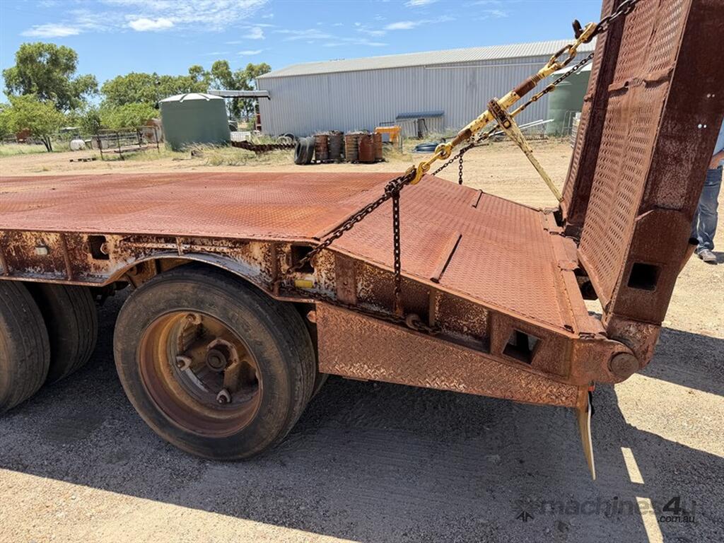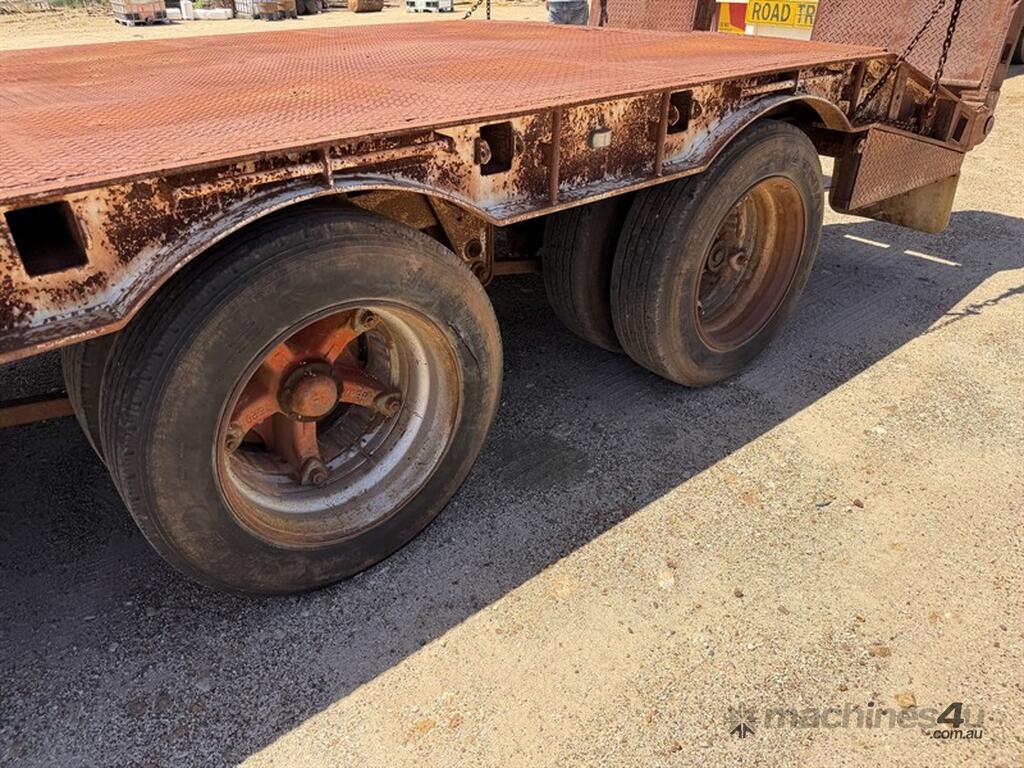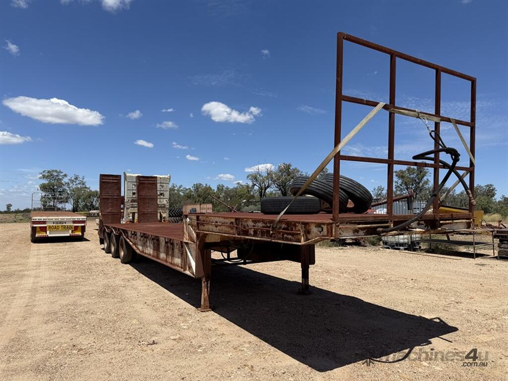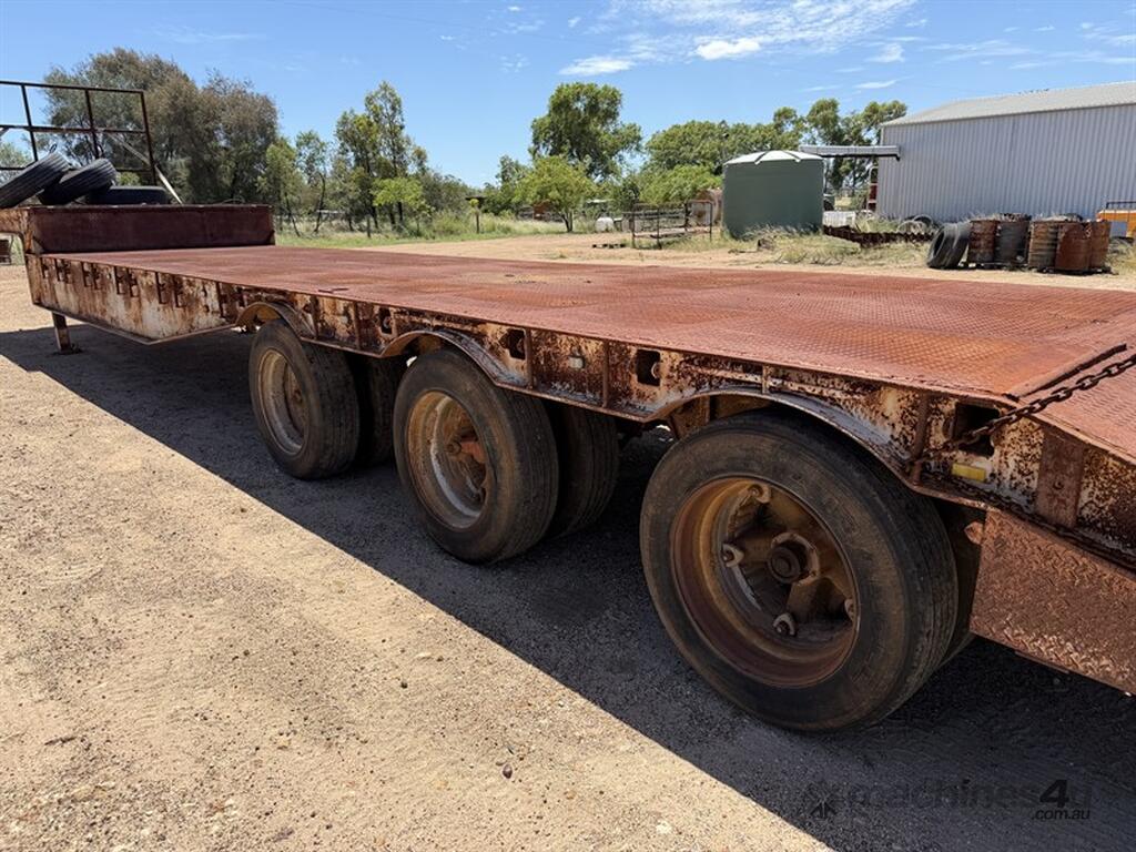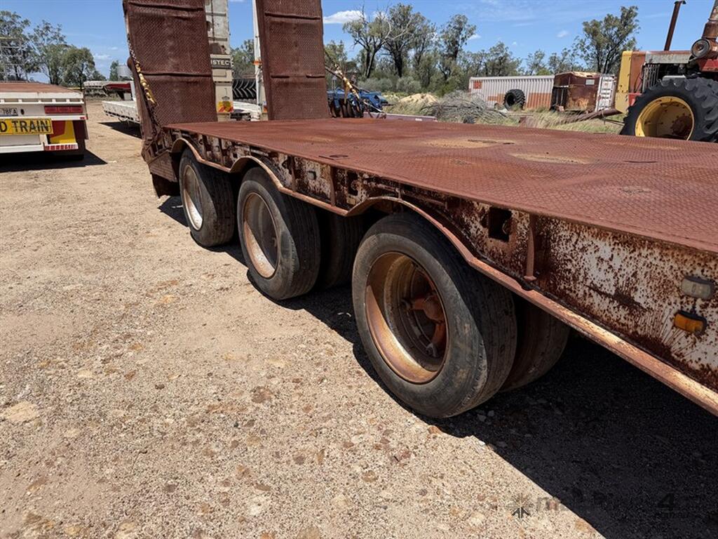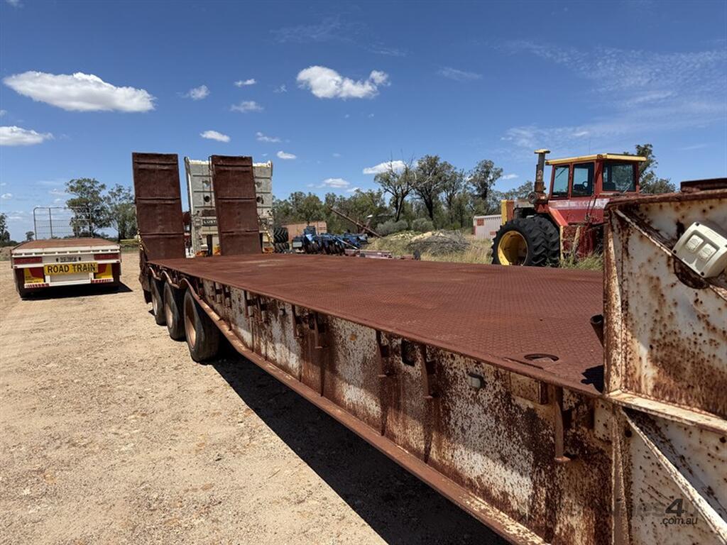 Fruehauf 45ft Step Deck Trailer, 255/70 22.5 tyres and axles, spare tyres, flooring OK, ramps, on springs, 20ft container pins. Available at MRE Auctions "Pye Reduction Sale" Clearing Sale. Contact Grady Sinclair on . Located Miles, QLD.