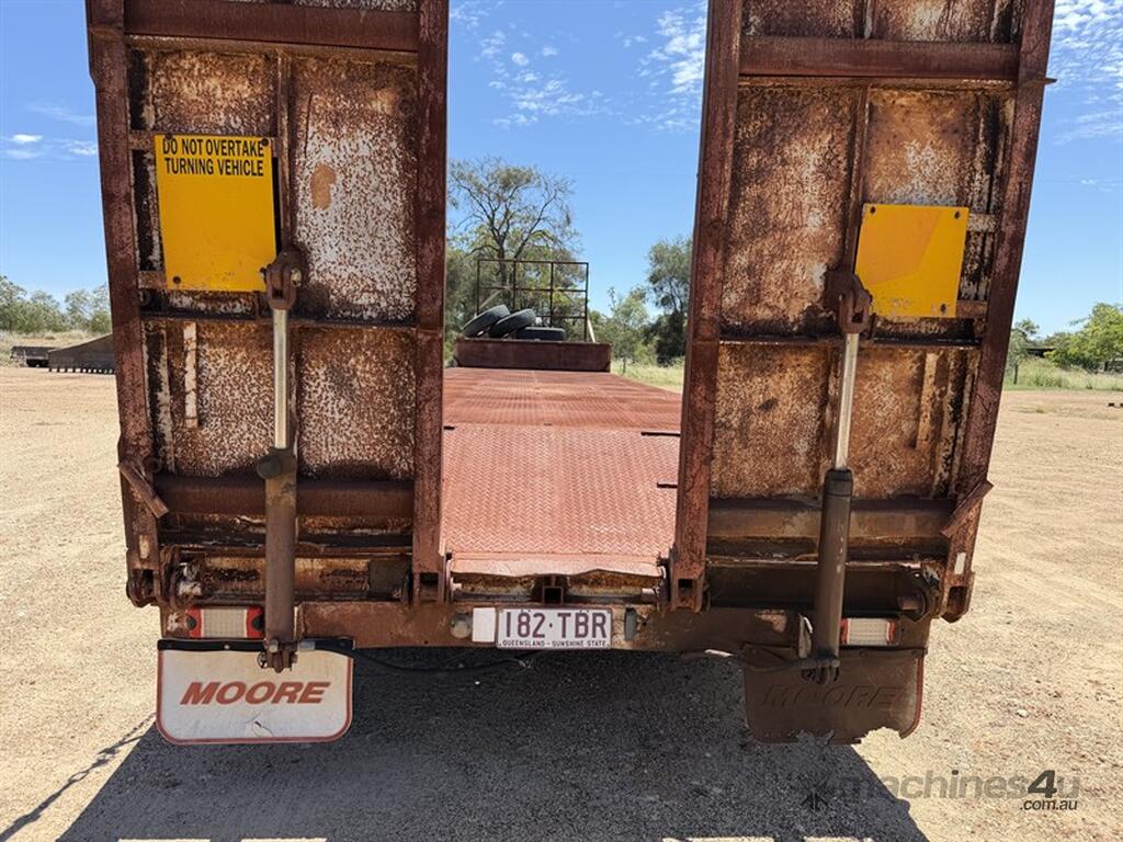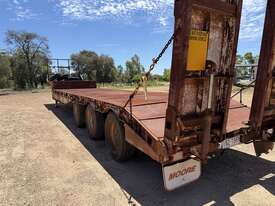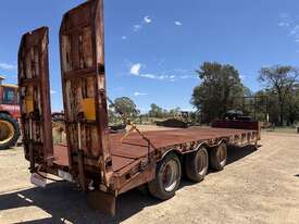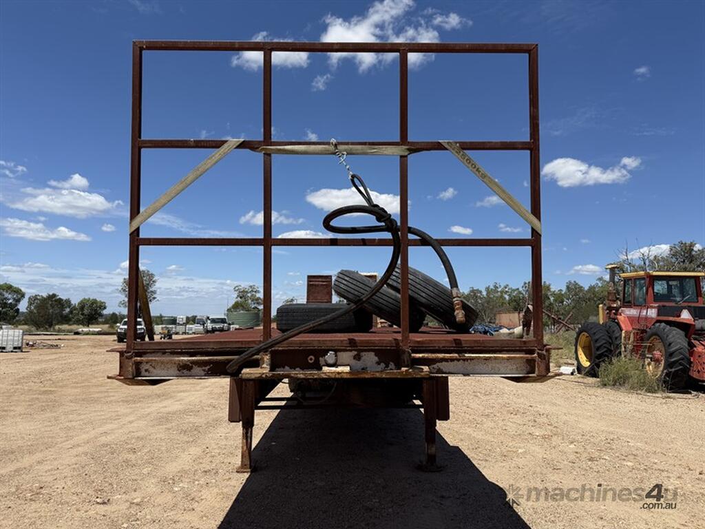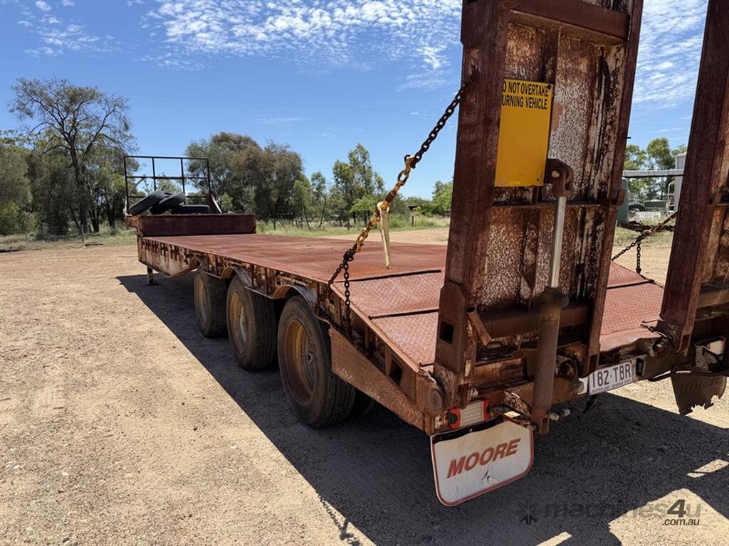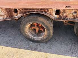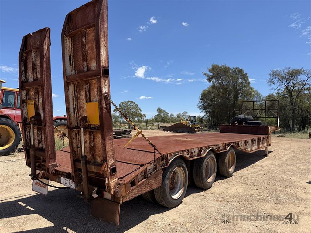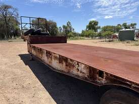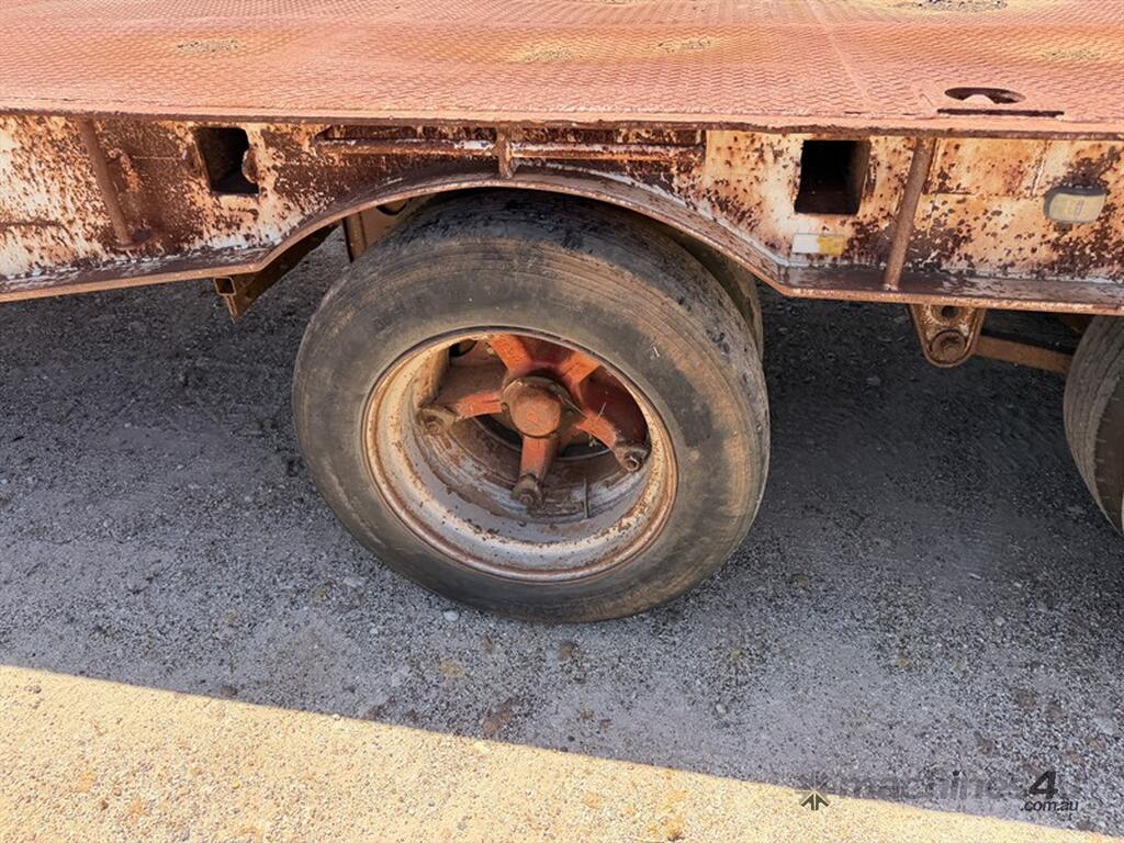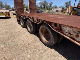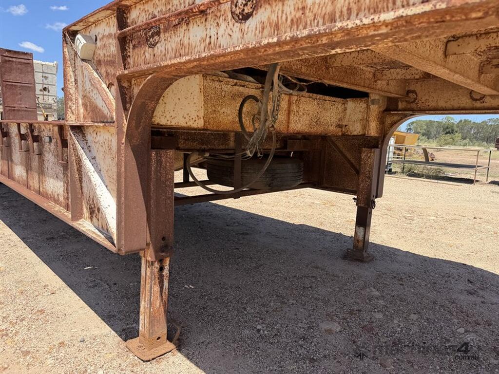 Fruehauf 45ft Step Deck Trailer, 255/70 22.5 tyres and axles, spare tyres, flooring OK, ramps, on springs, 20ft container pins. Available at MRE Auctions "Pye Reduction Sale" Clearing Sale. Contact Grady Sinclair on . Located Miles, QLD.