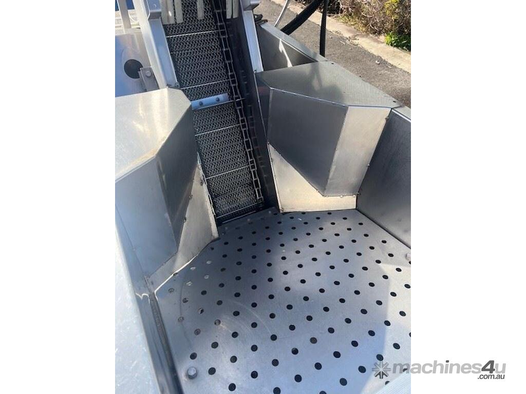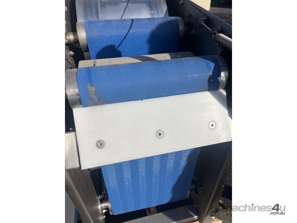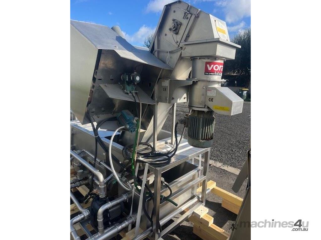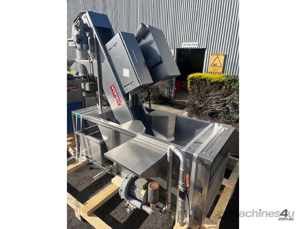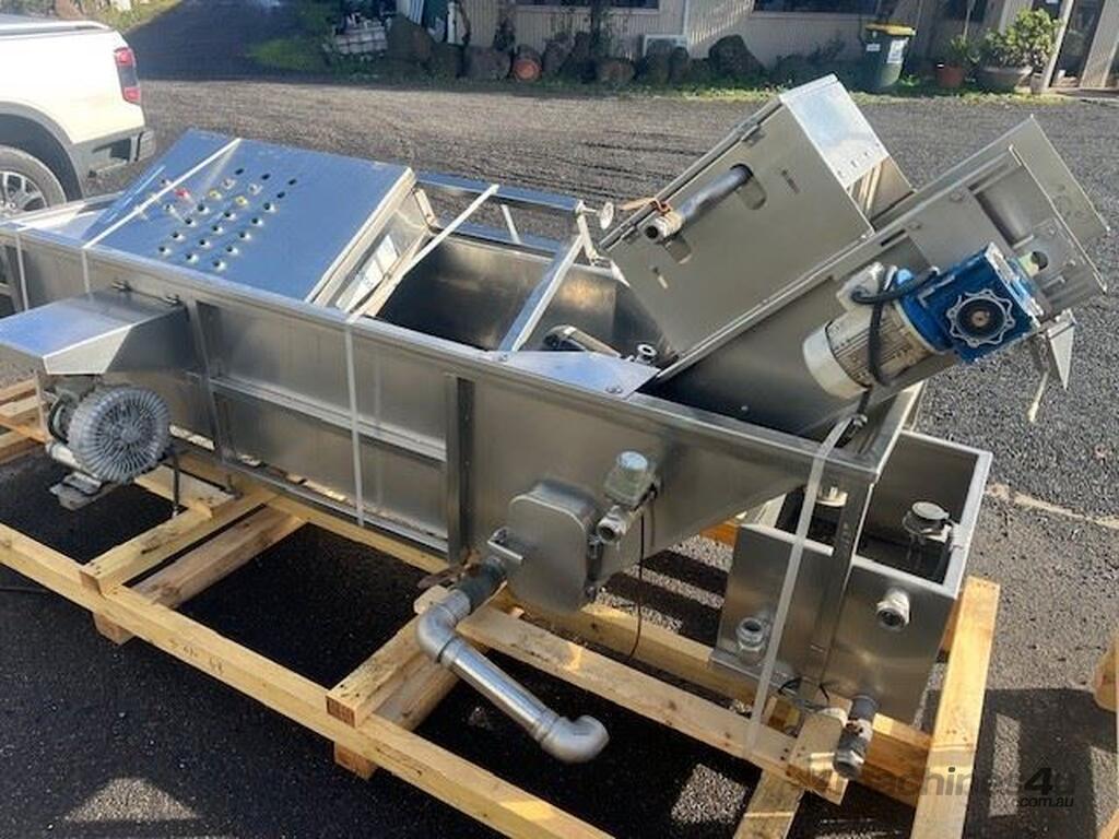 This line consisist of three major pieces of equipment. Stainless steel washer with incline conveyor. Wash trough 2m long x 700mm wide. Incline cleated belt 400mm wide. The fruit/veg is loaded into the wash trough which is full of water, the blowers push the product towards the incline belt, it travels up the cleated belt into the next section. After washing the produce is loaded into the incline conveyor
