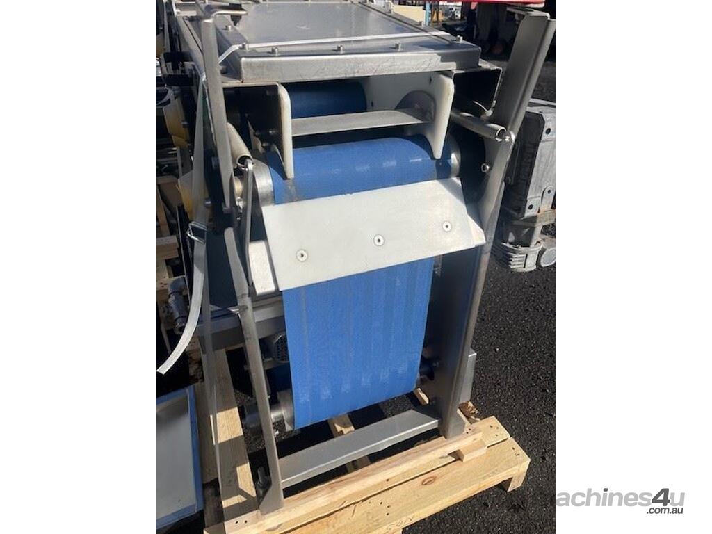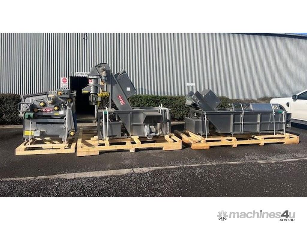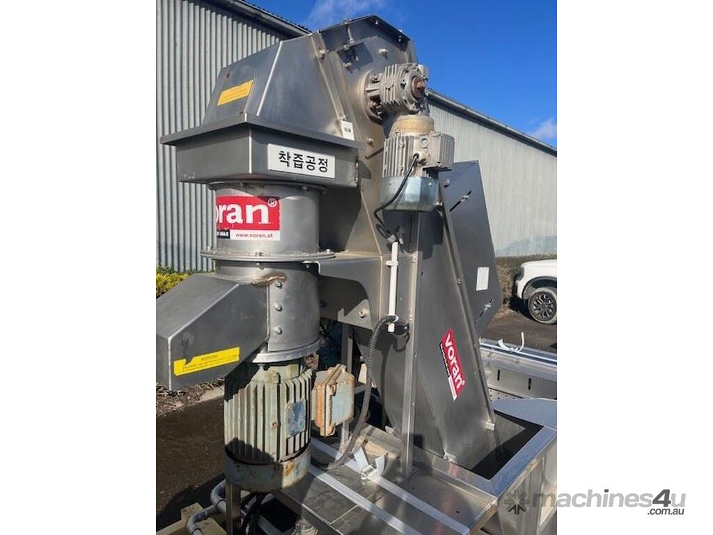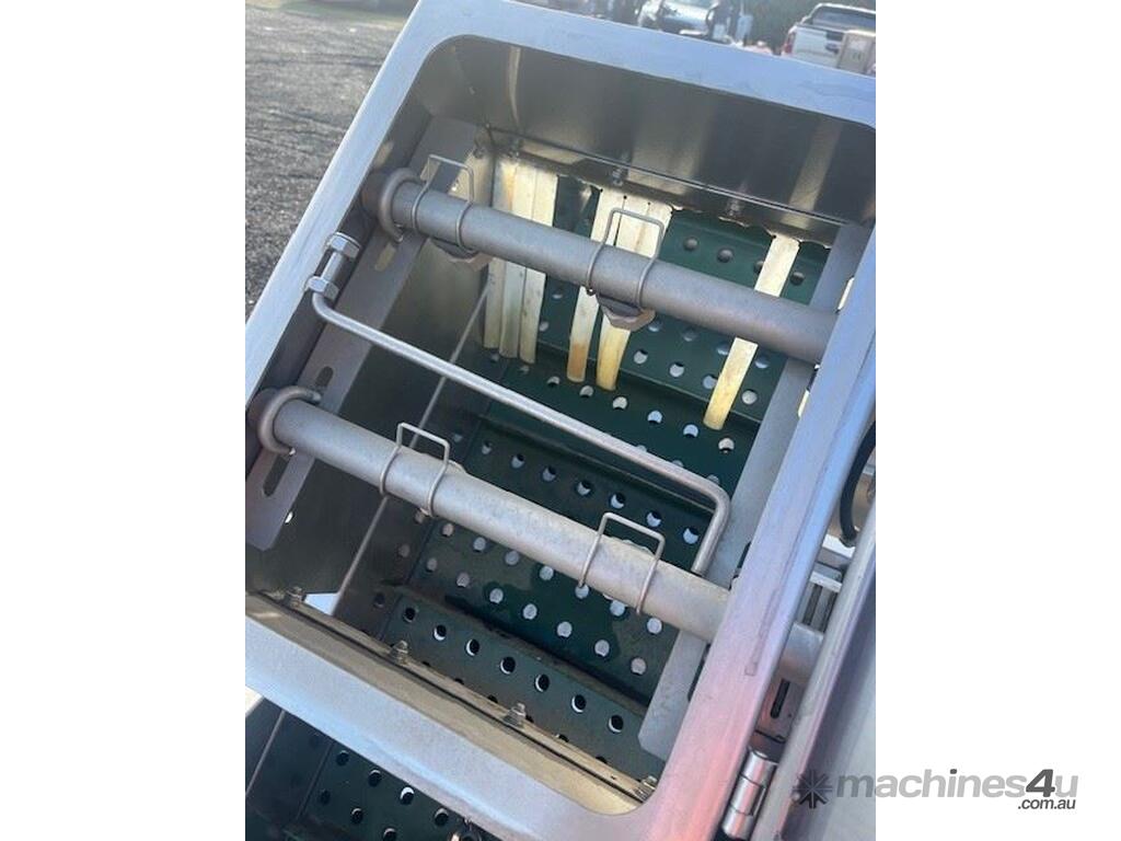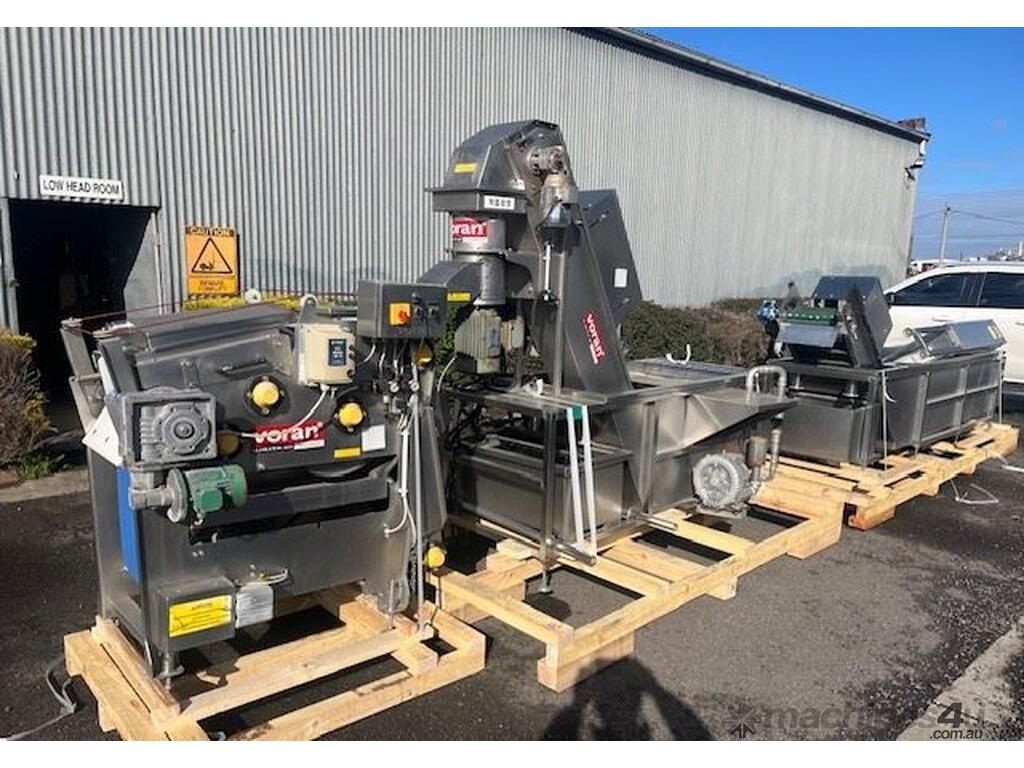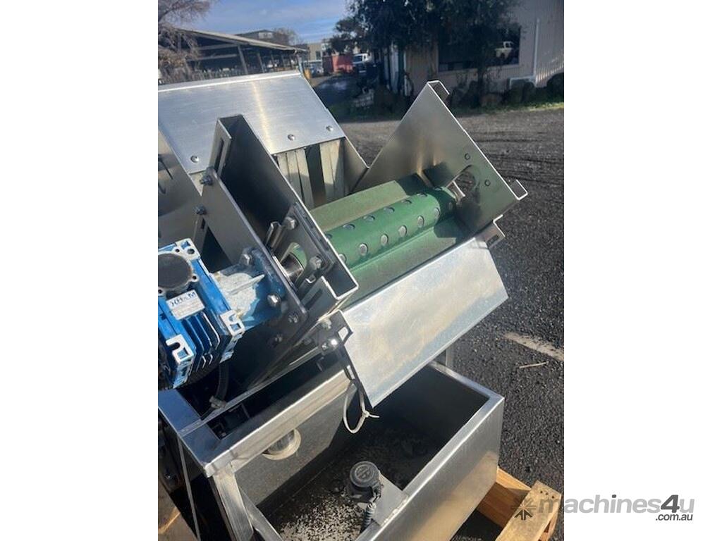 This line consisist of three major pieces of equipment. Stainless steel washer with incline conveyor. Wash trough 2m long x 700mm wide. Incline cleated belt 400mm wide. The fruit/veg is loaded into the wash trough which is full of water, the blowers push the product towards the incline belt, it travels up the cleated belt into the next section. After washing the produce is loaded into the incline conveyor