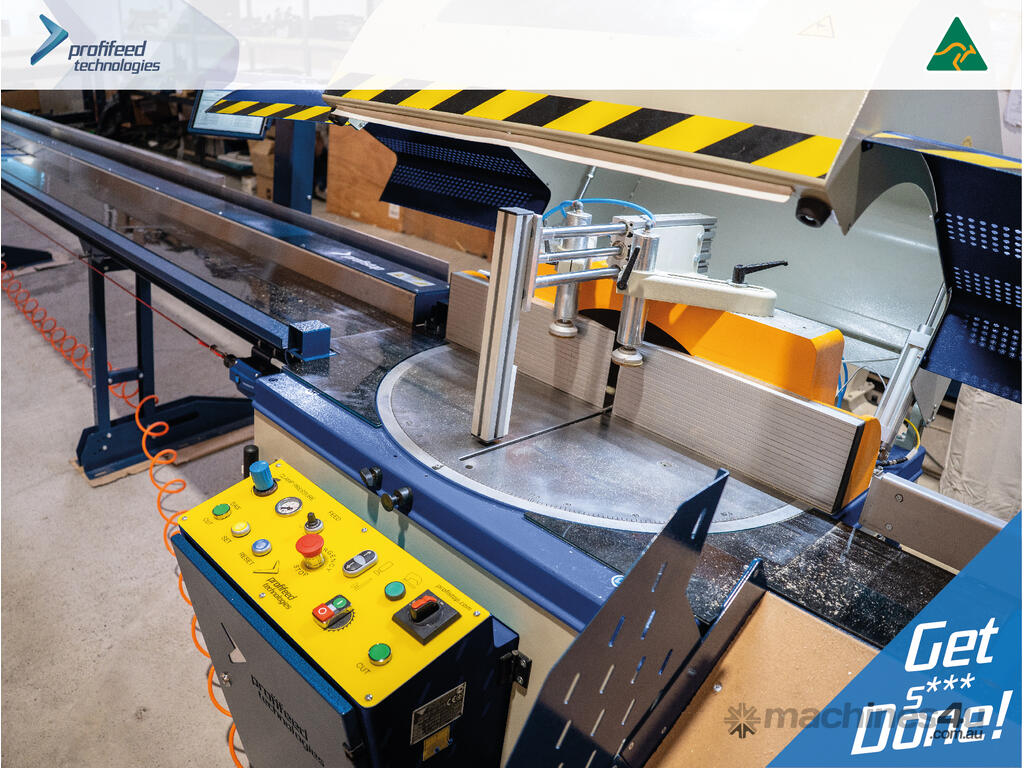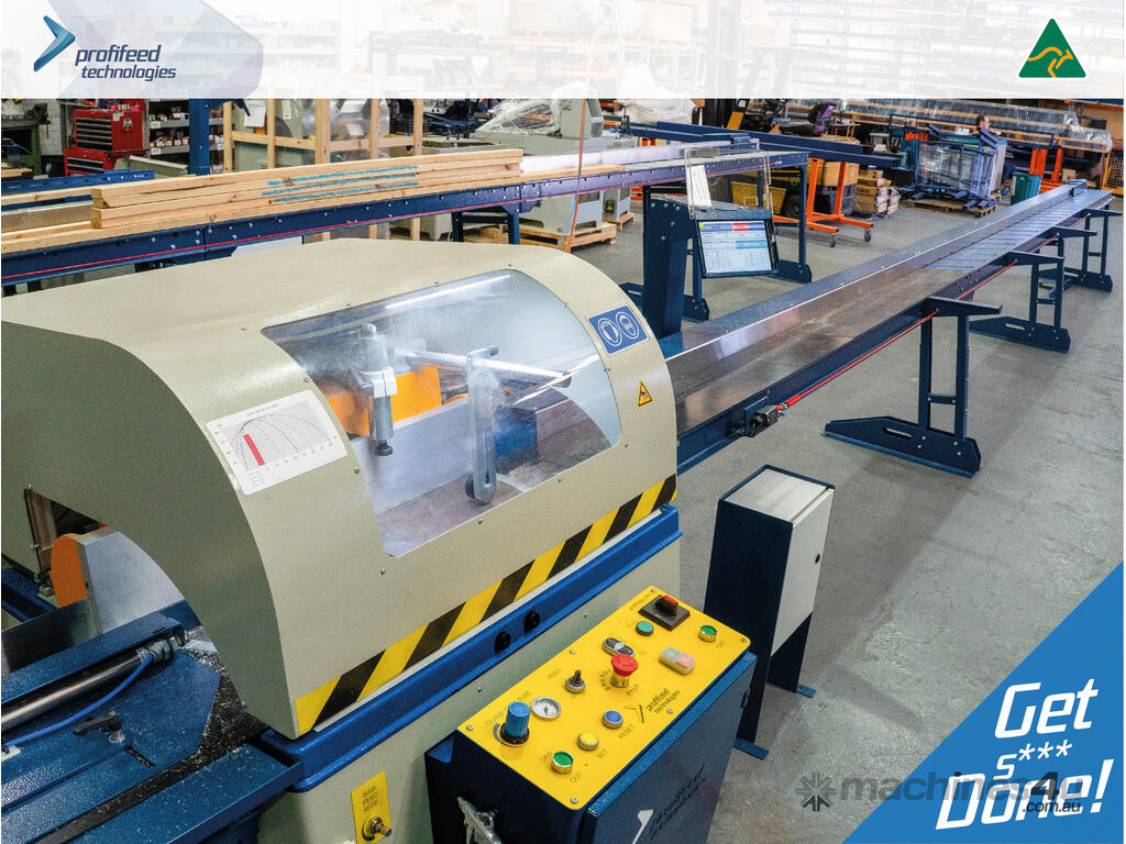 Optional fully automatic inline optimiser. Automatic measuring of aluminium profile lengths using a laser sensor and on-the-fly job list optimisation against the length measured for minimised wastage in offcuts. Automatic printing of job / part number labels for each part produced (optional).
