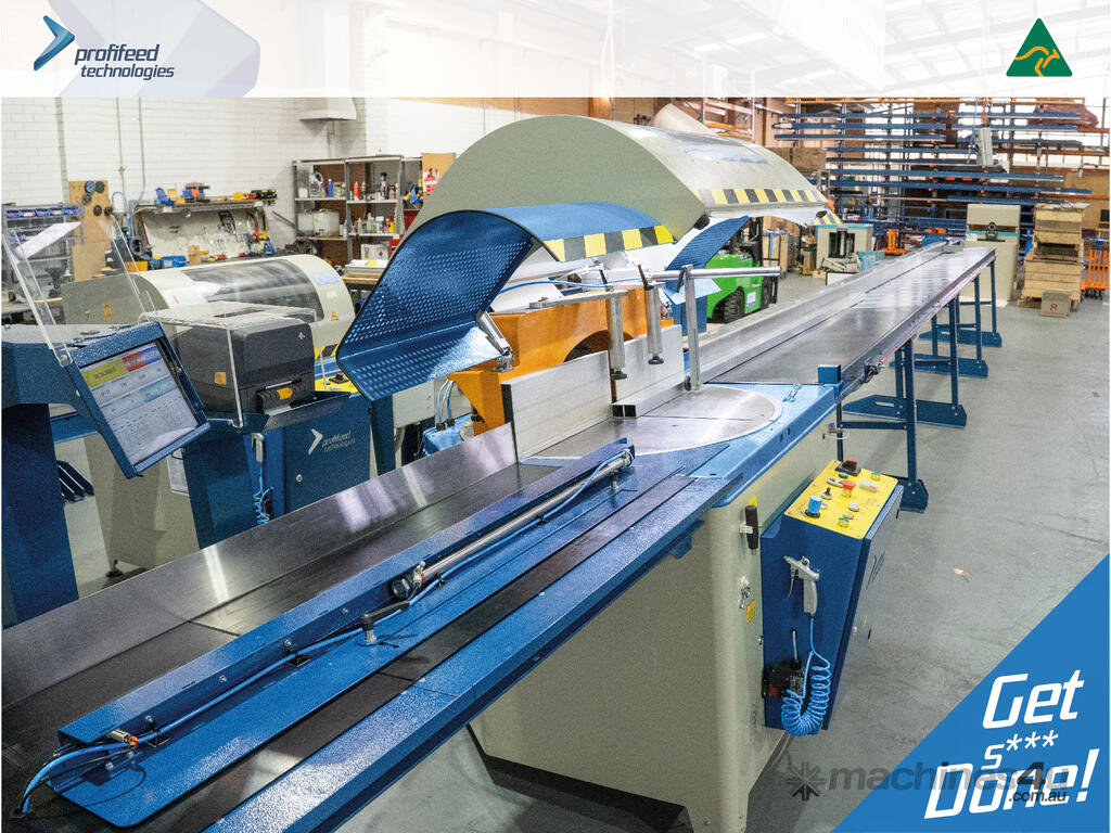 Optional fully automatic inline optimiser. Automatic measuring of aluminium profile lengths using a laser sensor and on-the-fly job list optimisation against the length measured for minimised wastage in offcuts. Automatic printing of job / part number labels for each part produced (optional).
