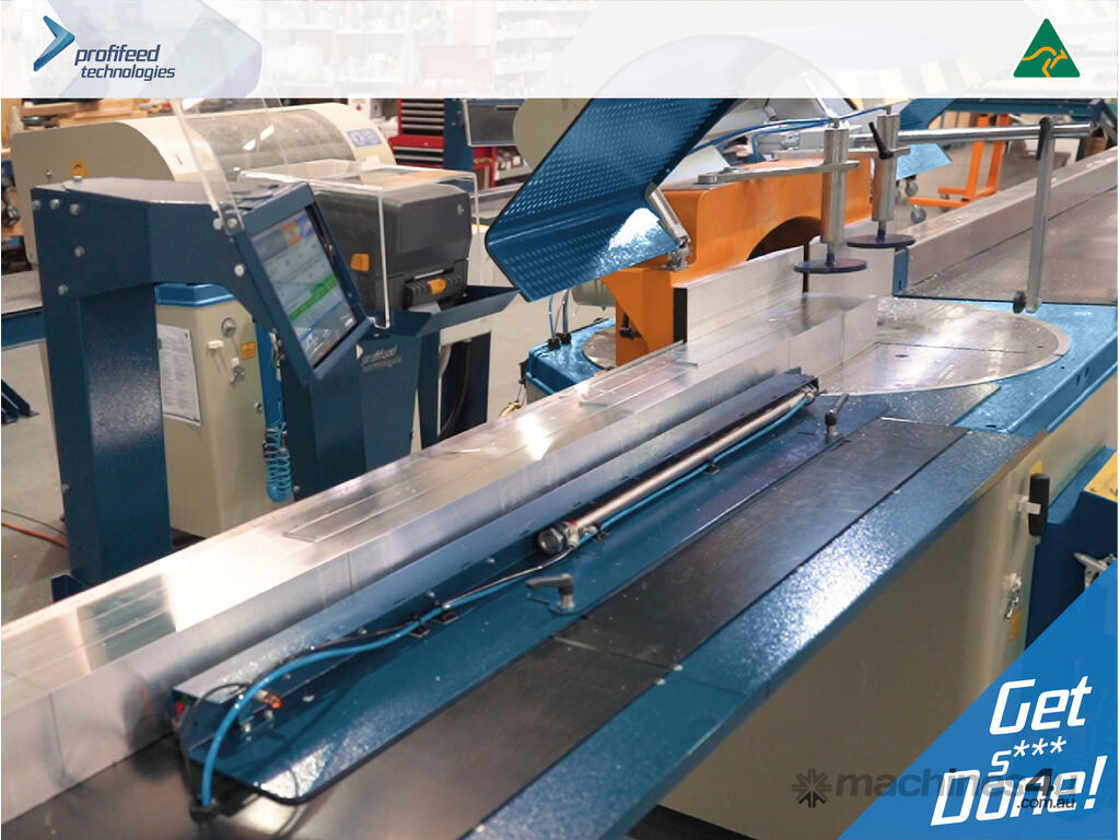Optional fully automatic inline optimiser. Automatic measuring of aluminium profile lengths using a laser sensor and on-the-fly job list optimisation against the length measured for minimised wastage in offcuts. Automatic printing of job / part number labels for each part produced (optional).