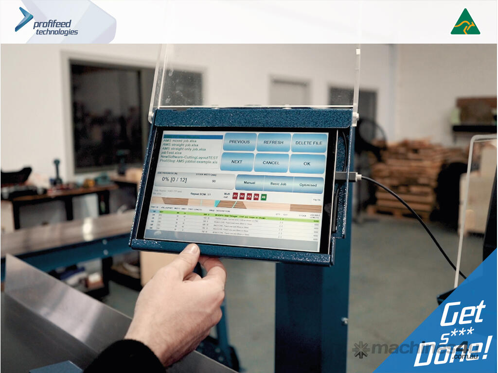 Optional fully automatic inline optimiser. Automatic measuring of timber lengths using a laser sensor and on-the-fly job list optimisation against the length measured for minimised wastage in offcuts. Automatic printing of job / part number labels for each part produced (optional).