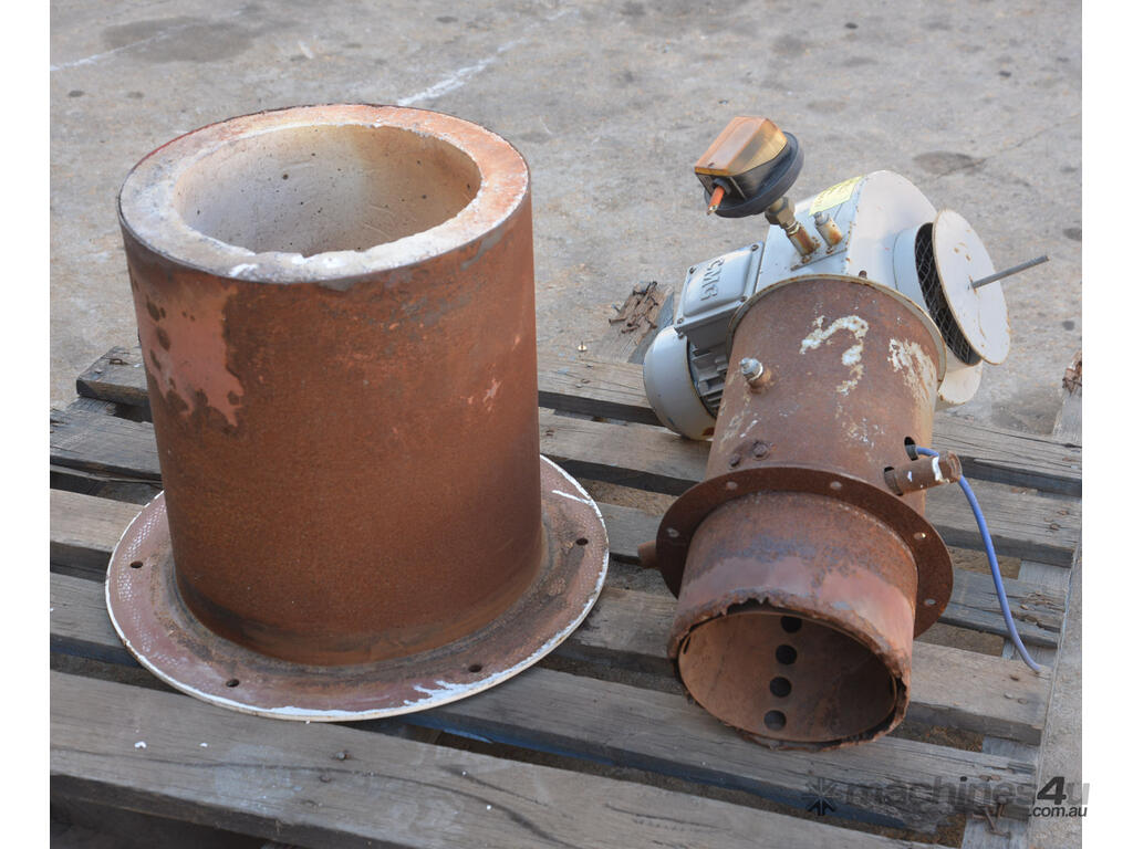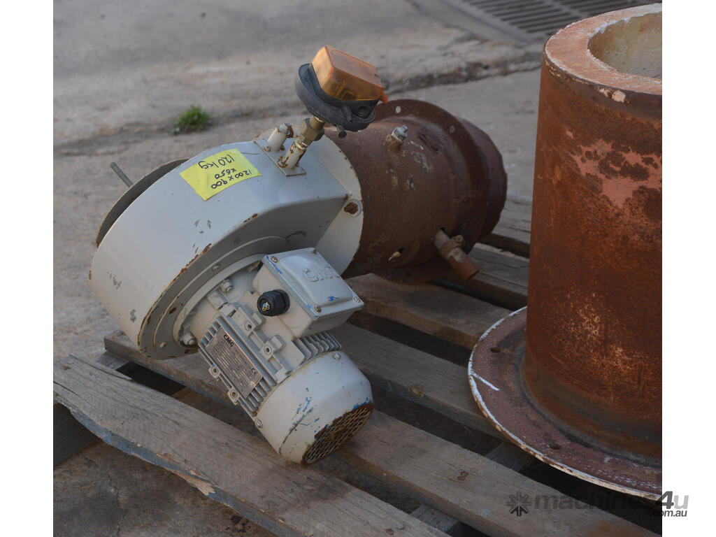 Furnace burner assembly with refractory ceramic fire tube and integral 0.37kW combustion air fan blower.
