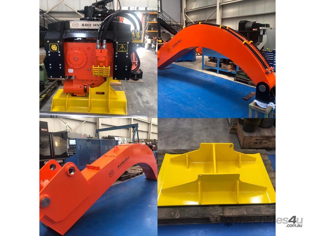 With the Excavator mounted vibrohammer, the pile can be lifted to a vertical position using the built-in lifting chain, where it is then gripped tightly in a powerful hydraulic jaw. SMS offers a wide range of EMV’s, the EMV’s range from 5kgm up to 12kgm and is a highly cost-efficient way of driving sheet piles and tubes. To extend reach and height, SMS can supply a “gooseneck” in various sizes. A gooseneck is an attachment which can be mounted on the jib of the excavator mounted vibratory hammer to extend its reach. SMS EMV hammers are an ideal combination with excavator capacities ranging from 4 to 45 ton capacity.
