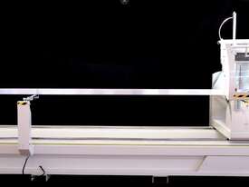 * Double head cutting off machine with a fixed sawing head on the left and one movable on the right side. Automatic positioning of the movable head