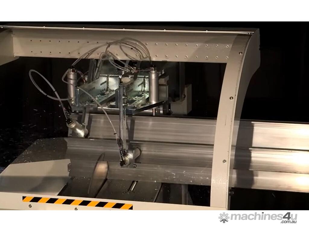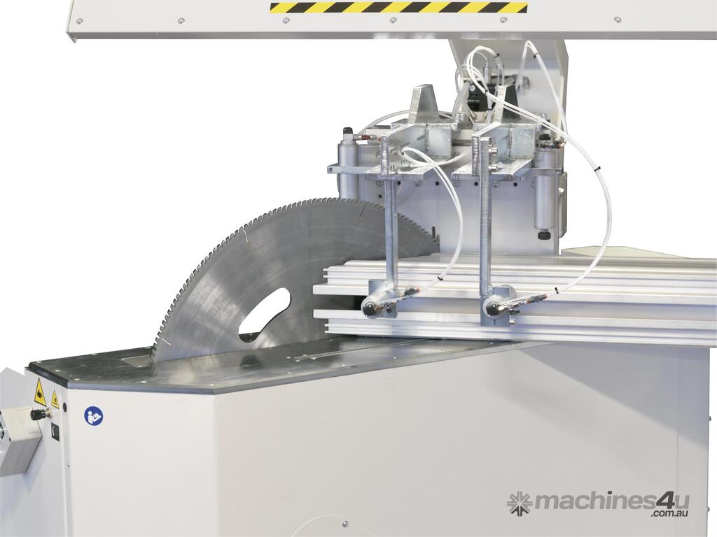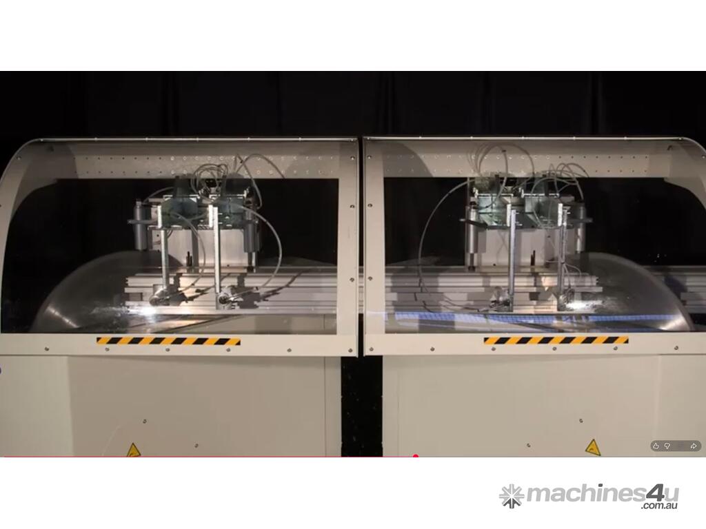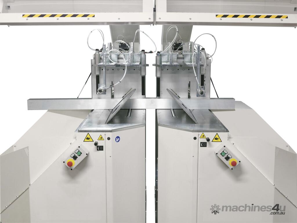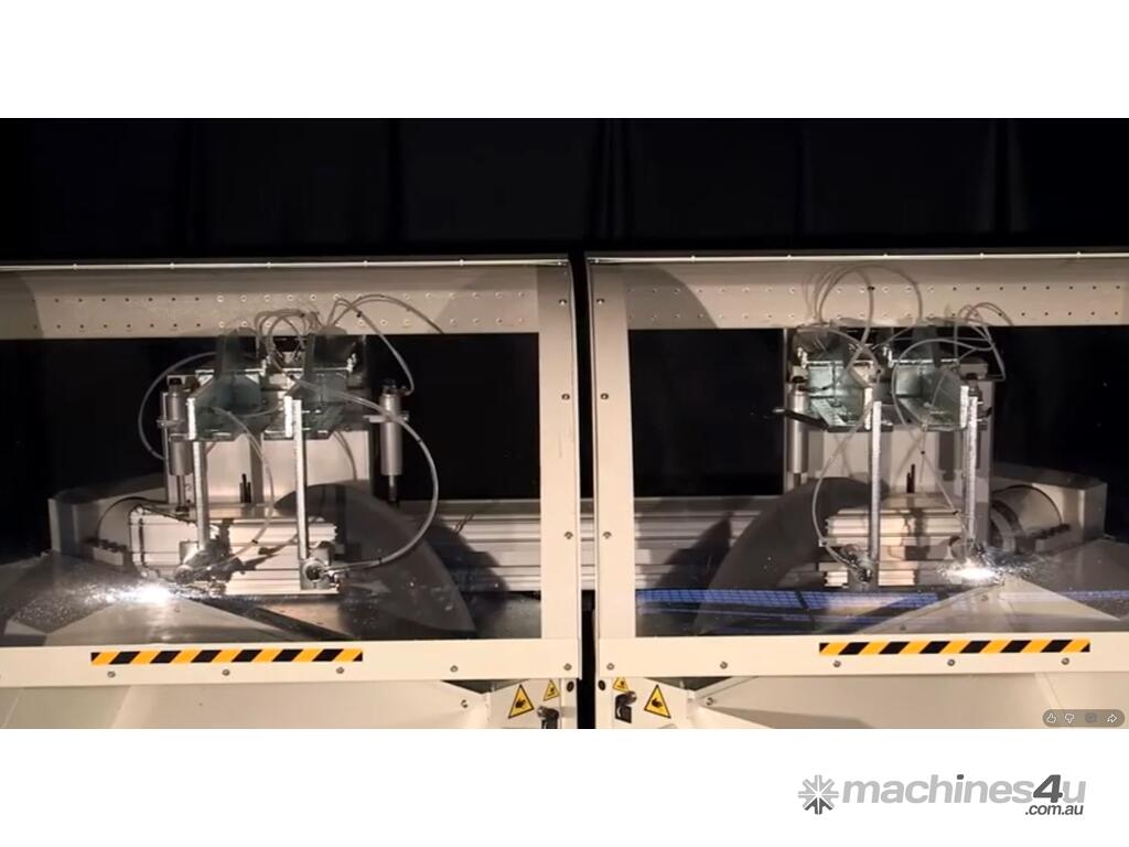 Two head mitre saw with ascending blades w automatic blade rotation and inclination.