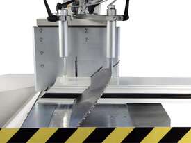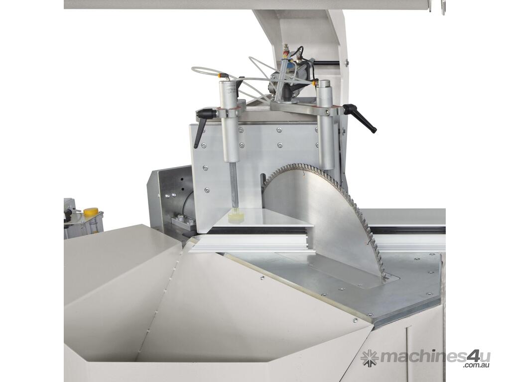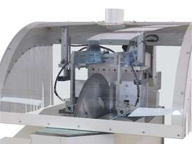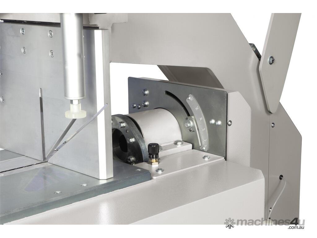 Single-head cutting-off machine with pivoting and tilting upstroke blade for compound cuts.