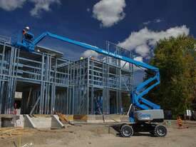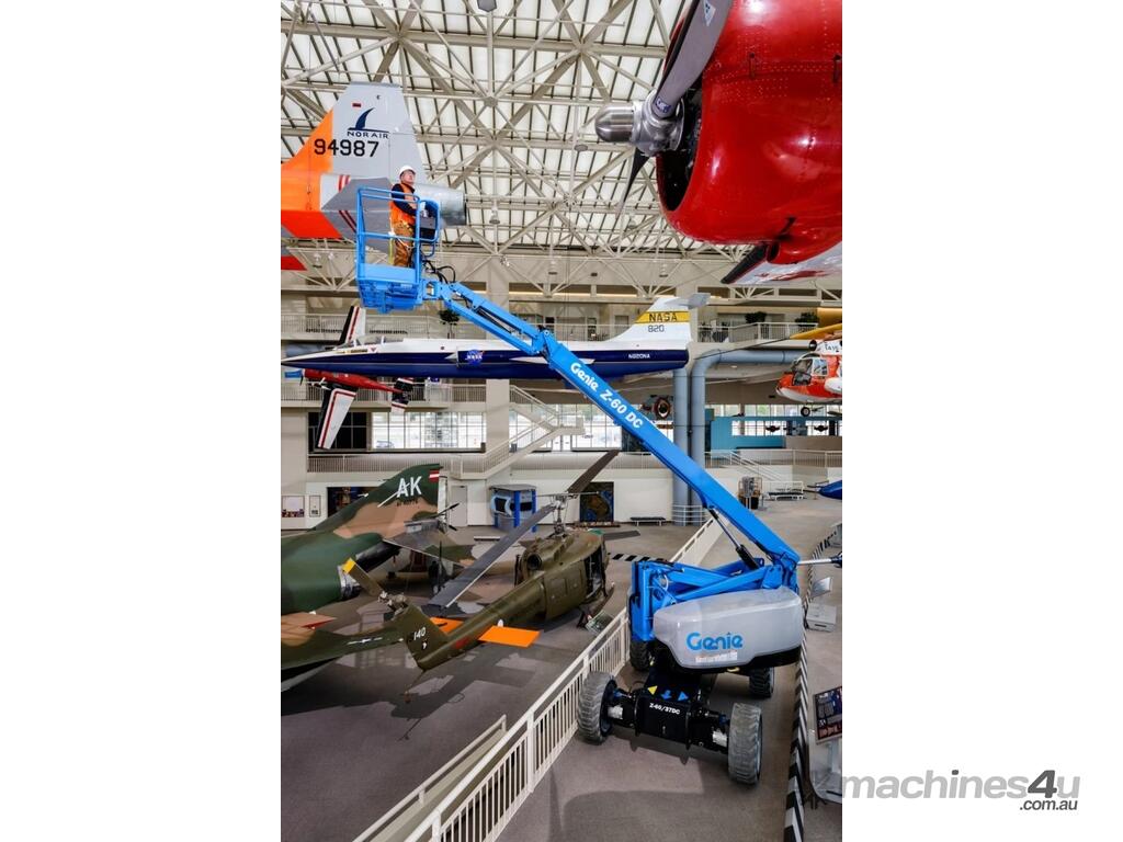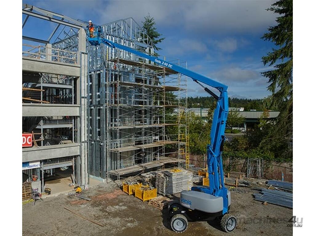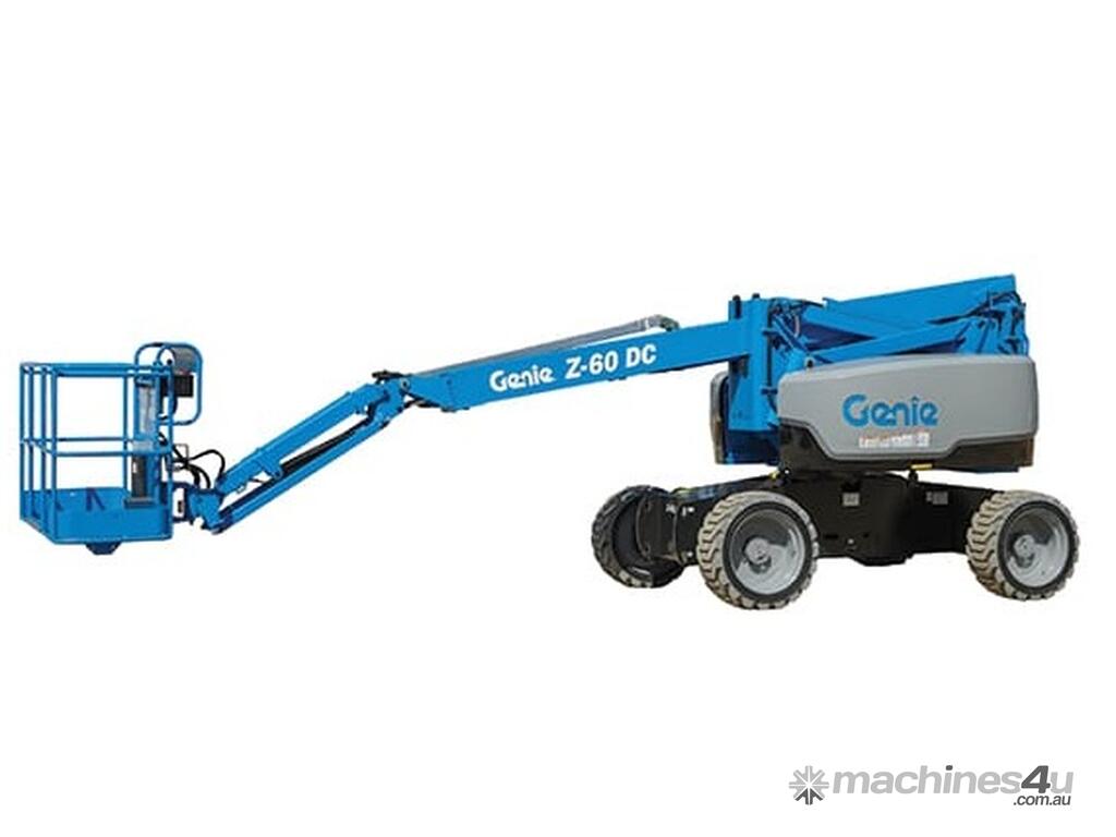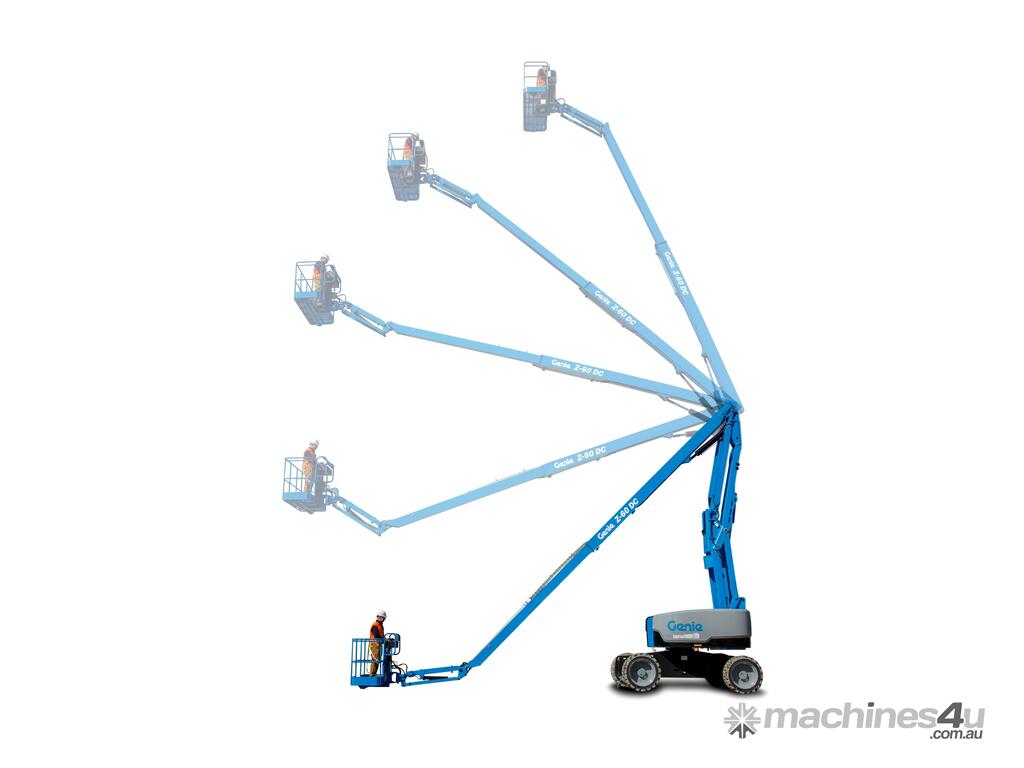 Thanks to its quiet, clean performance and four-wheel drive abilities, this Genie® Z®-60 DC is a versatile, all-electric articulating boom lift, ideal for a number of outdoor and indoor applications on construction sites, sports arenas, malls, facilities, and even challenging pedestrian areas.