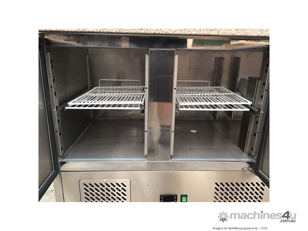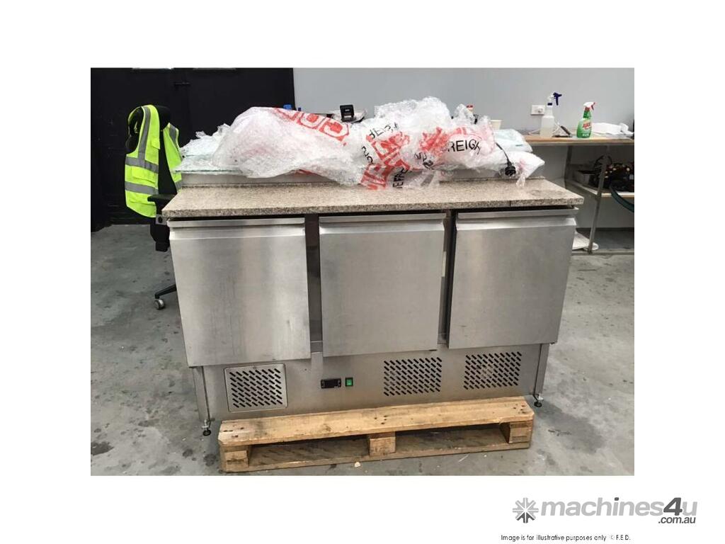 GNS1300E Three Door Salad Marble Prep Top444 LitreGlass CoverTakes 7 × 1/3 GN pans × 150 mm deep*Stainless Steel interior & exterior*Can be positioned against walls