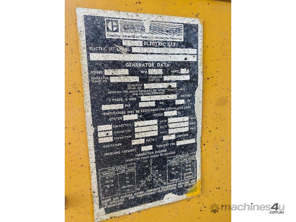 Cat 165kw Standby 206kva. 415v 3 phase. Engine Cat 3304 1500rpm 6 cyl Diesel Turbo . Hours Run 569. Cat Alternator with complete switch board. Inbuilt base fuel tank. Radiator cooled. All in Running condition. Only used as factory Standby.