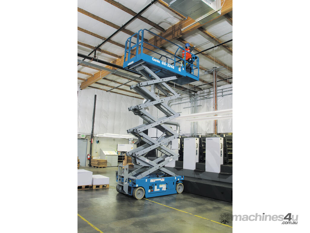 Compact dimensions and zero inside turning radius make the Genie® GS™-3246 E-Drive slab scissor lift ideal for indoor and outdoor construction, maintenance, and installation tasks on level ground and in tight spaces. Boasting the state-of-the-art Genie AC electric E-Drive system, it offers unmatched efficiency and runtime when a significant amount of driving is required.