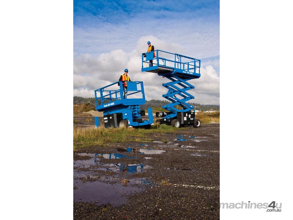 The Genie® GS™-3369 RT rough terrain scissor lift is built for extra-rugged performance and is able to traverse through uneven rough terrain environments.