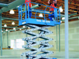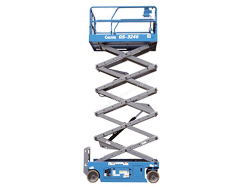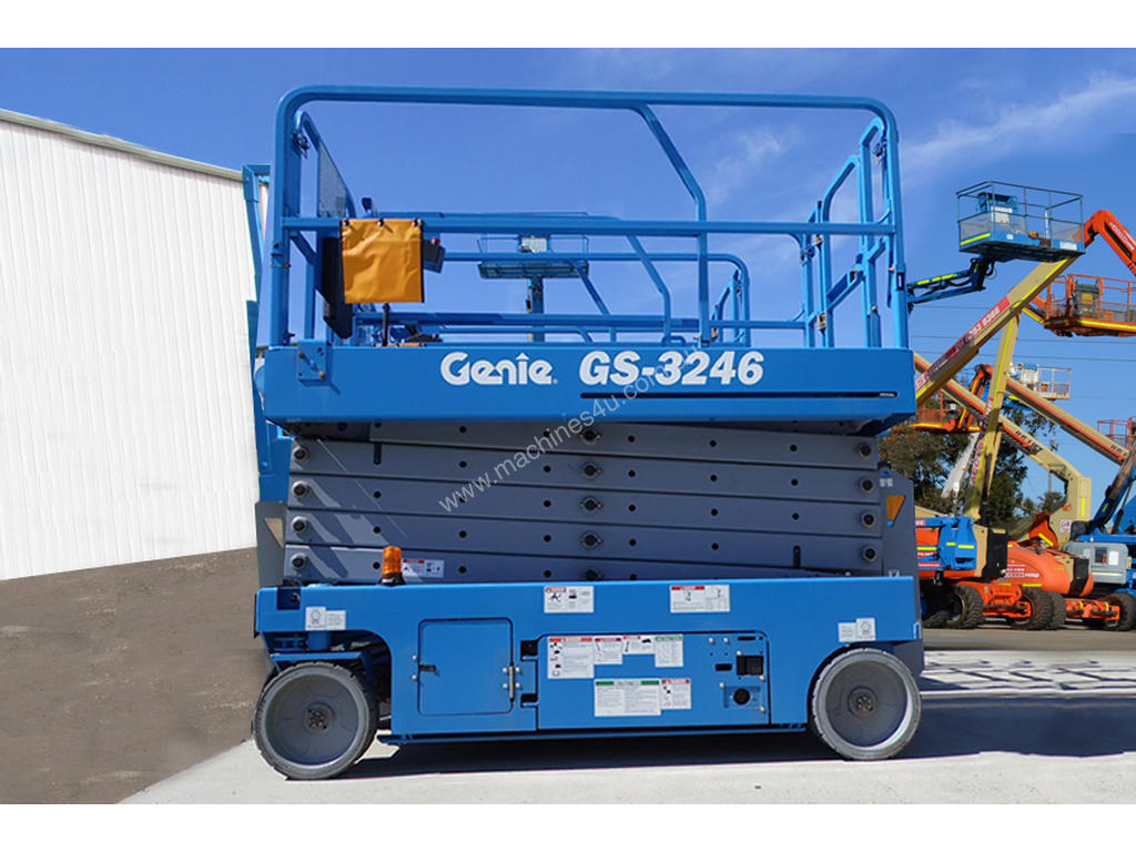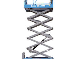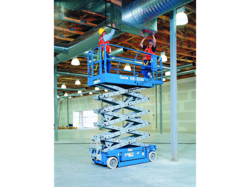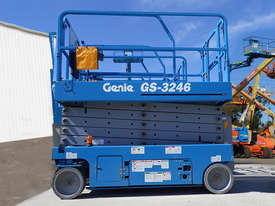 The Genie GS-3246 is a 32 ft electric scissor lift with a 700 lb platform capacity, ideal for indoor and slab work with tight access.