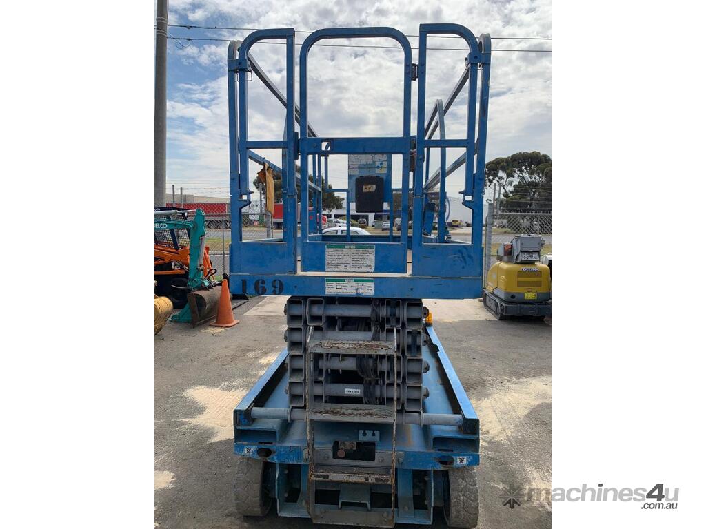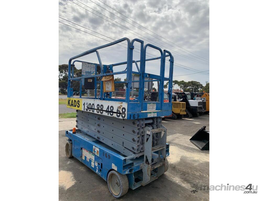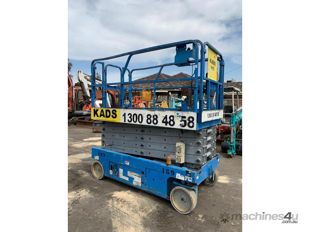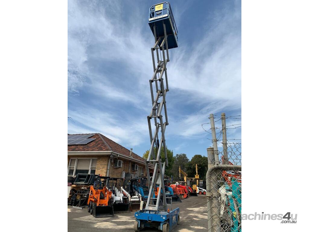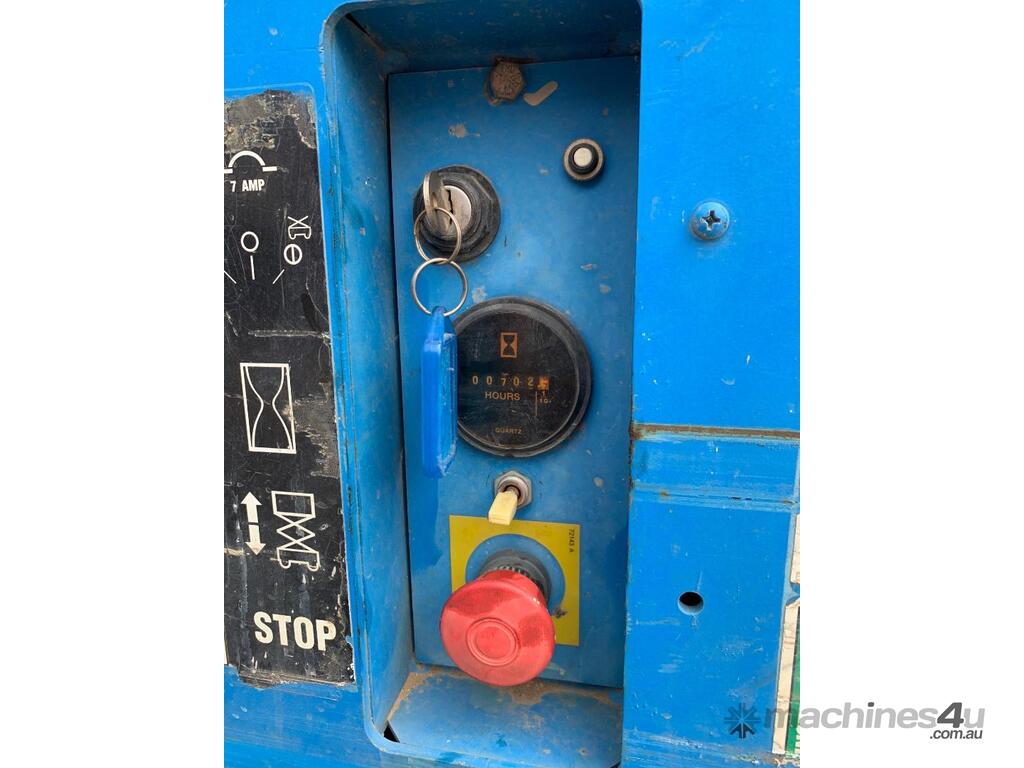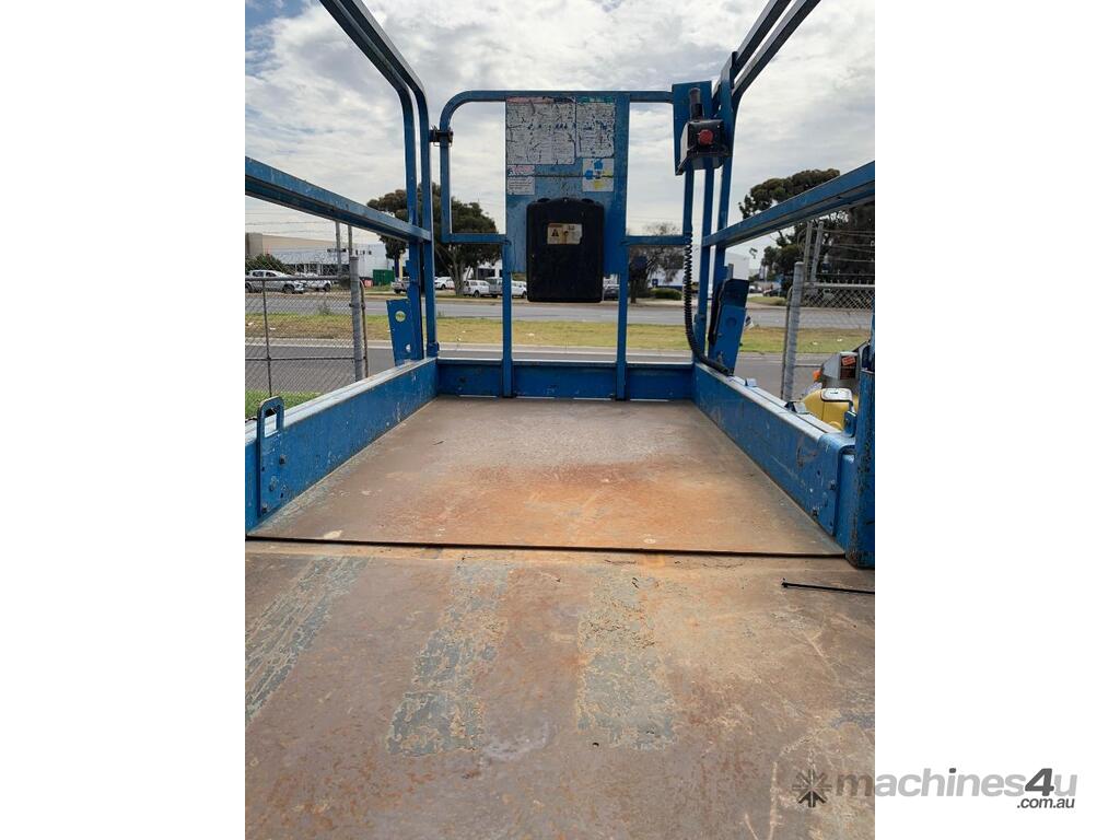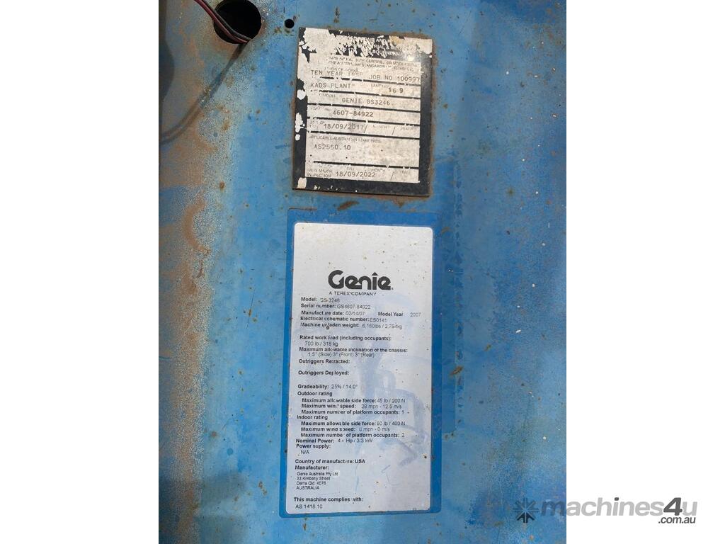 Genie GS 3246 scissor lift, ,2007 model, serial No. GS4607-84922, last inspection 18/09/2017 (exp. 18/9/2022), 11.75m max. platform height, 318 KG max plat form capacity, slid out extension deck, showing approximate 702 hours, $13,950 + GST...